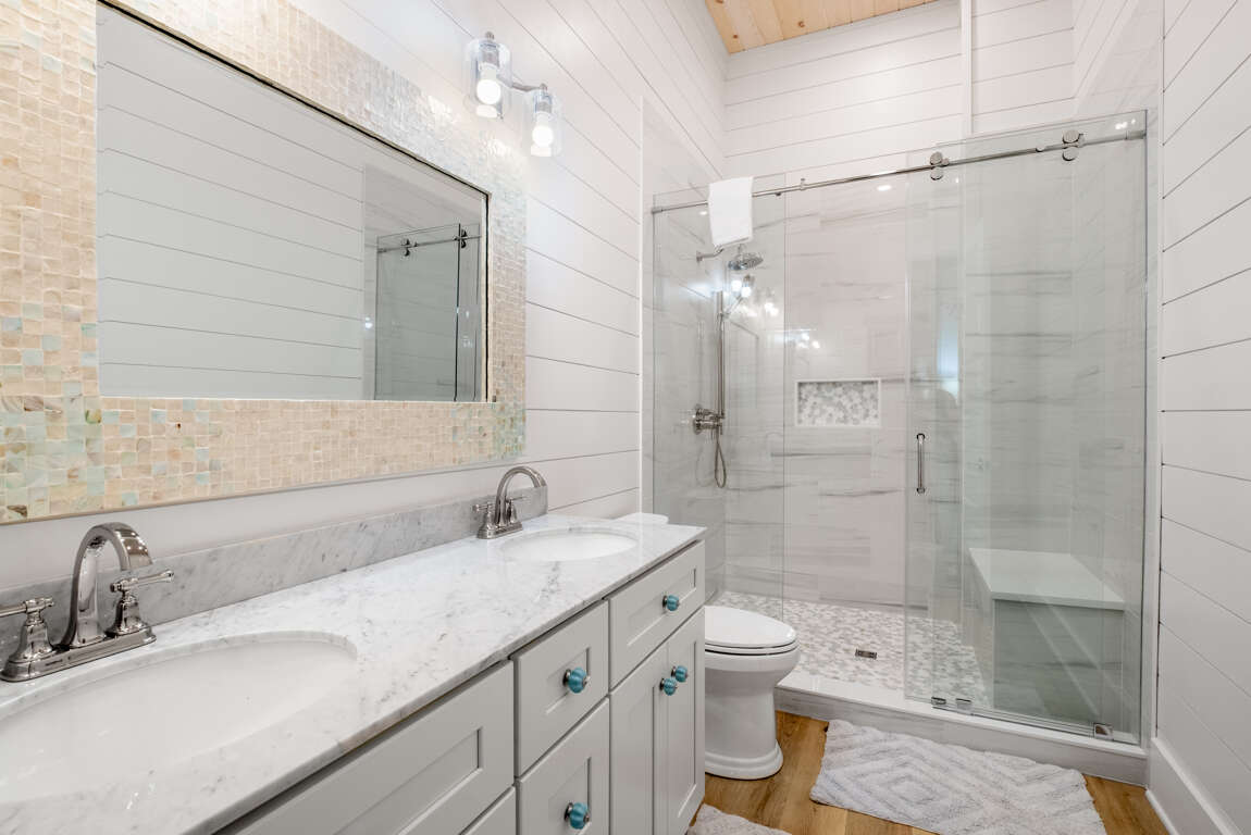 • The fifth bedroom is a private escape a queen over queen bunk and twin over twin bunk beds with a bathroom with double sinks and a walk-in shower.