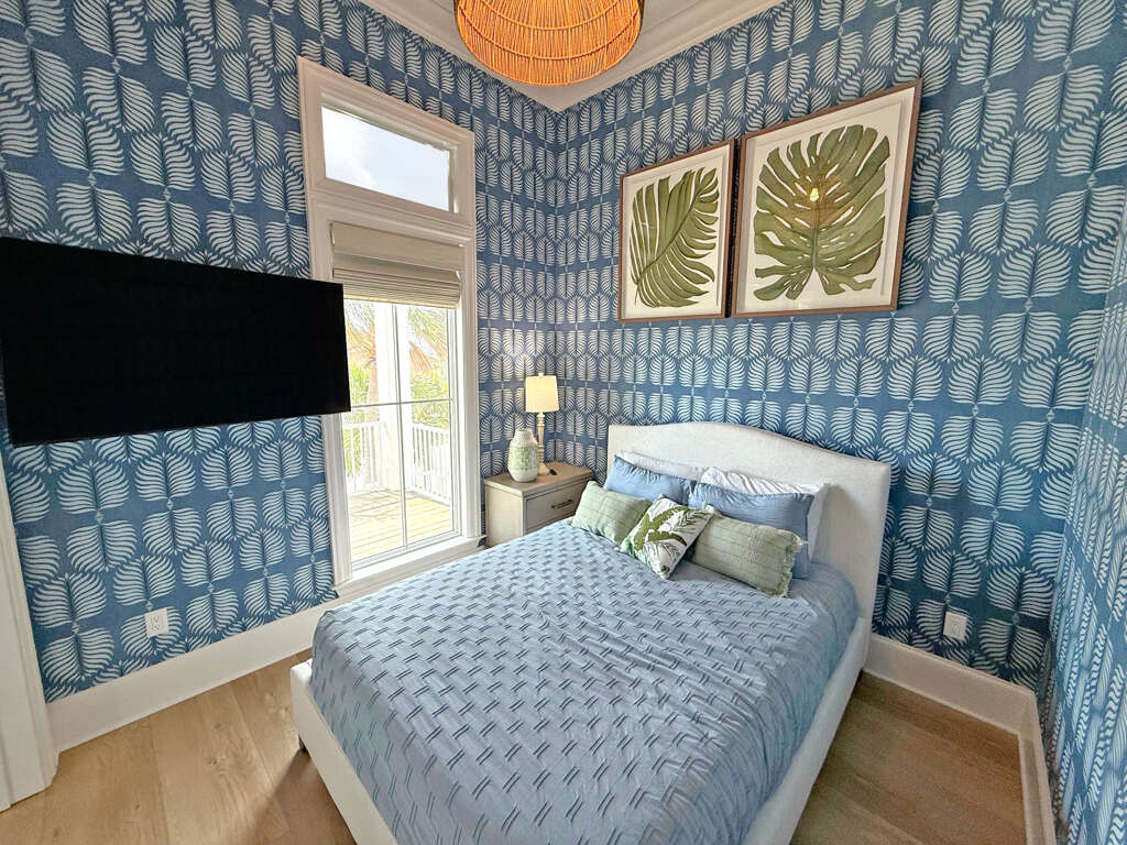• The fourth bedroom is a whimsical haven for kids, featuring two built-in twin-over-queen bunk beds, palm-leaf-themed walls, a sitting area, and a bathroom with double sinks and a walk-in shower.
