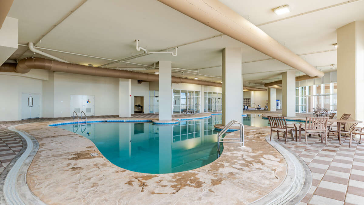 Zero-entry outdoor pool with waterslide connecting to a lazy river