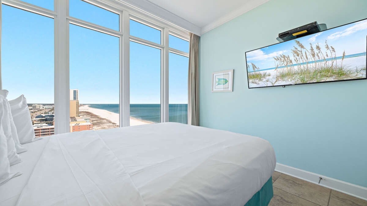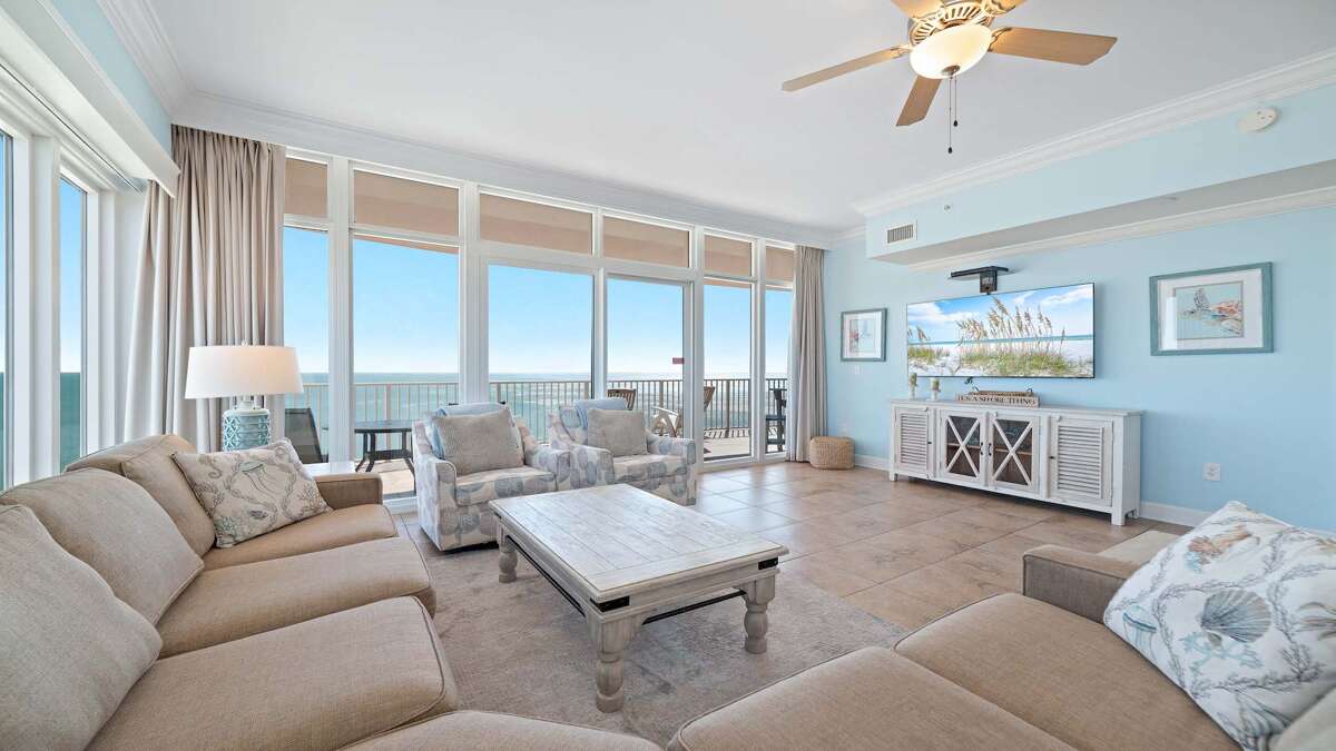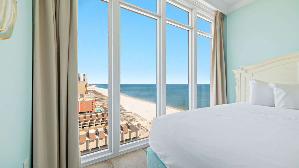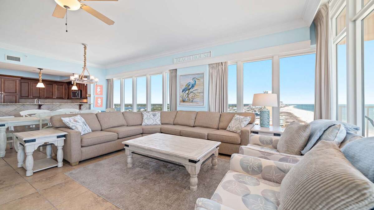 Corner 14th-floor condo rental with Gulf views from balcony and floor-to-ceiling windows in Orange Beach, a spacious place to stay for up to 14.