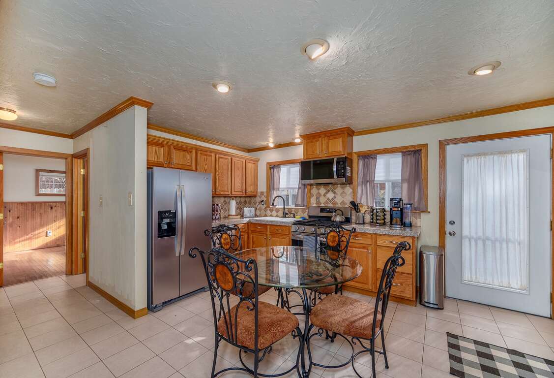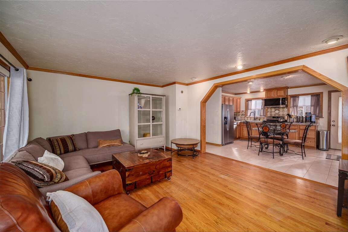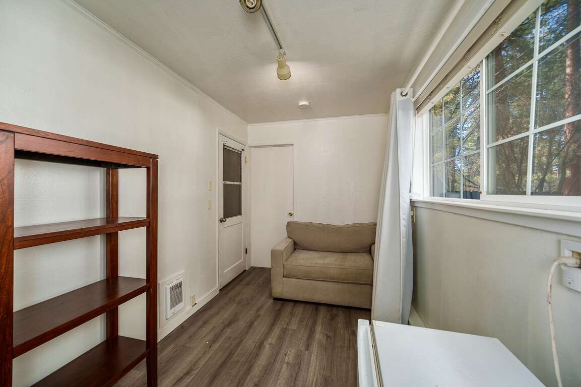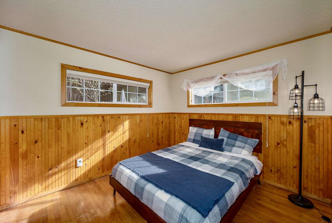 • Main level (up a few stairs): kitchen, living room, two bedrooms, and a full bathroom