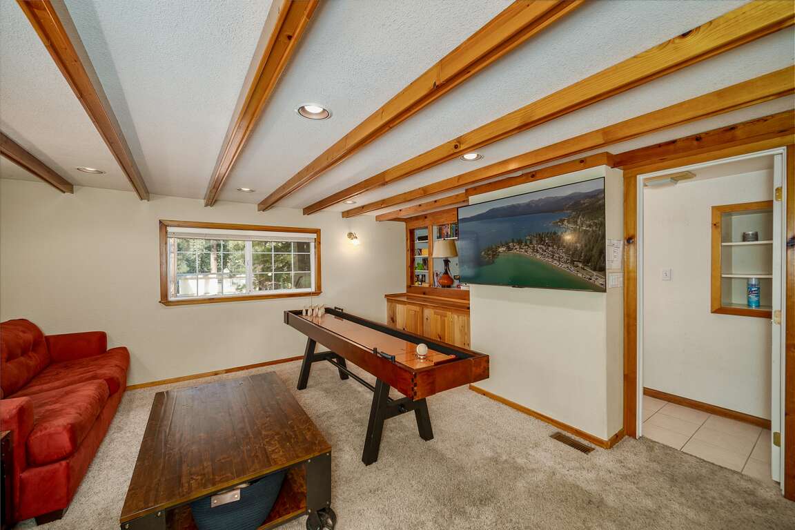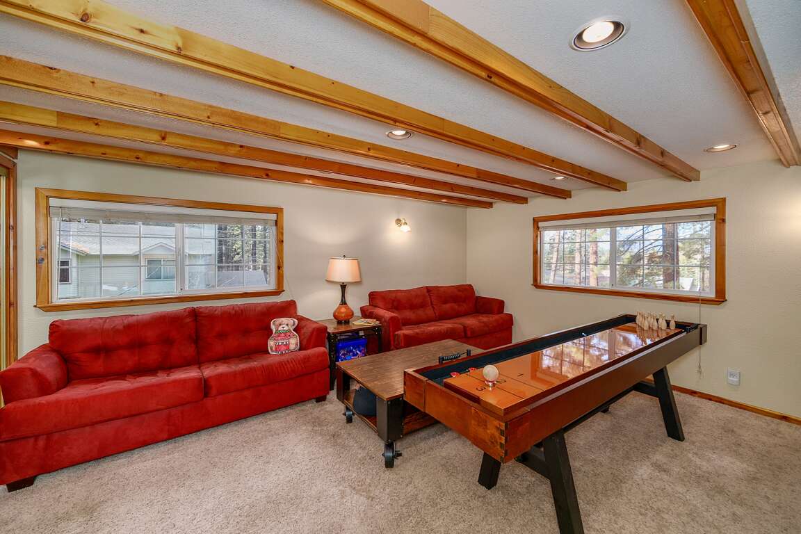 • Large upstairs family & game room with shuffleboard, games, and TV—perfect for movie nights and relaxing after a day outdoors