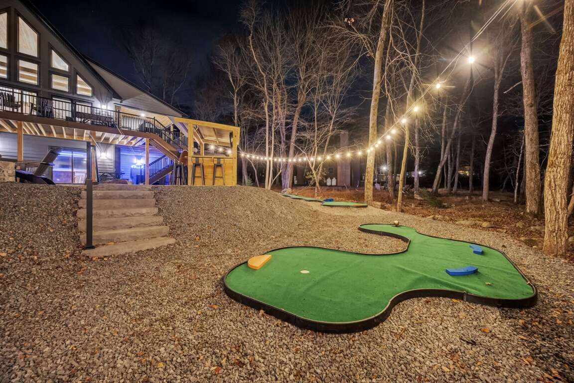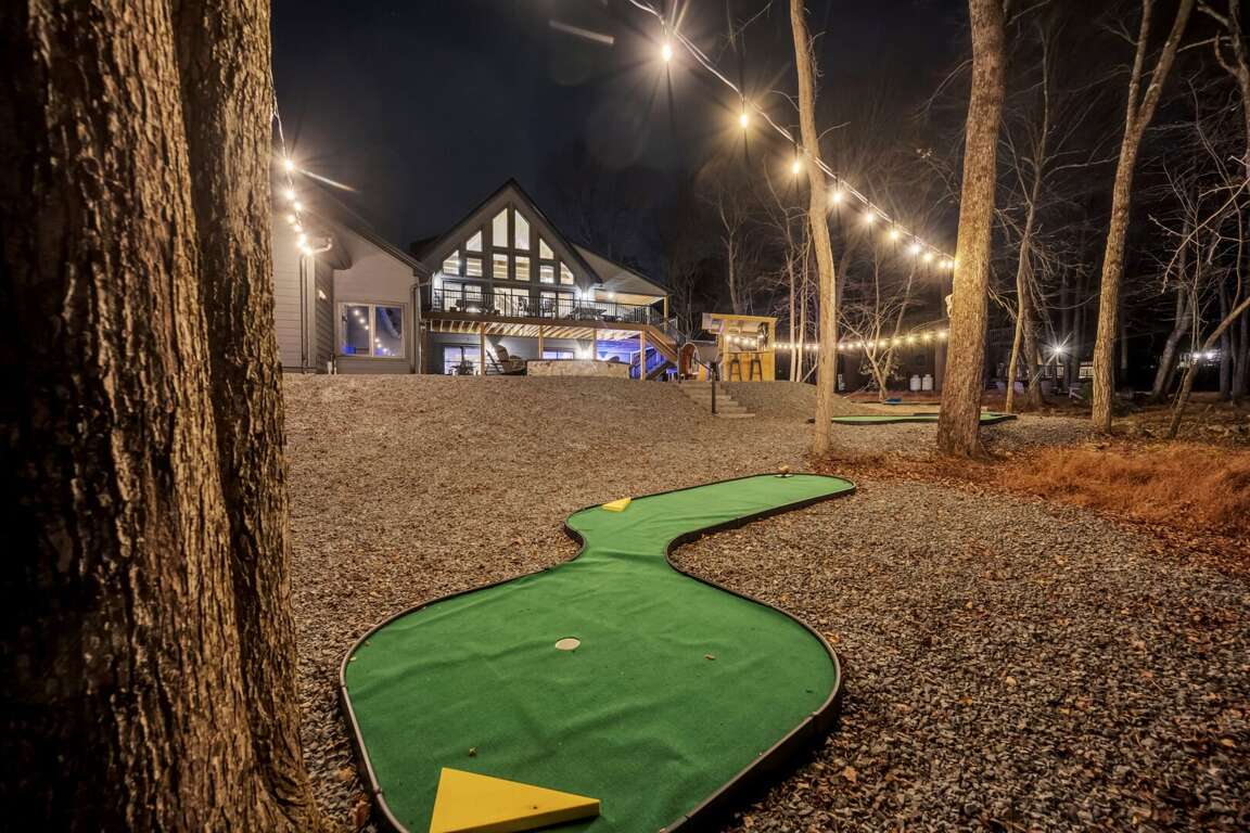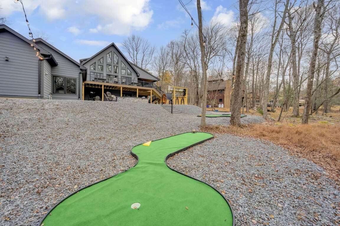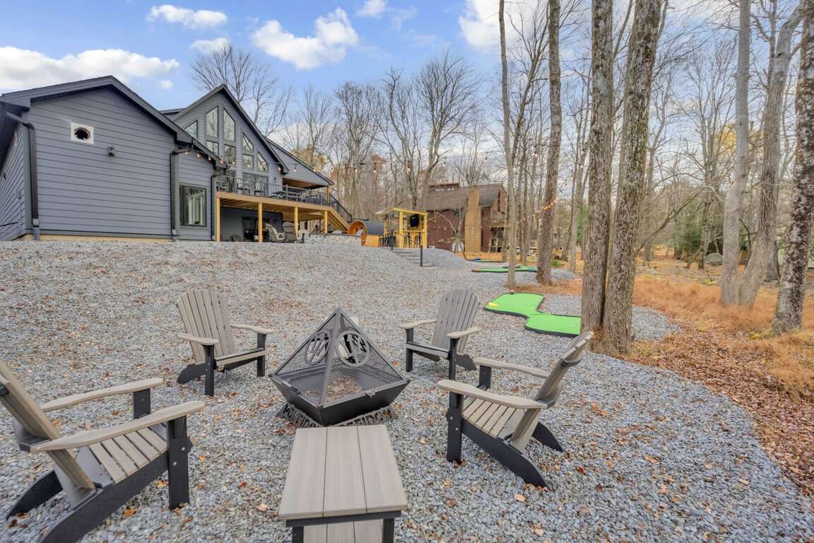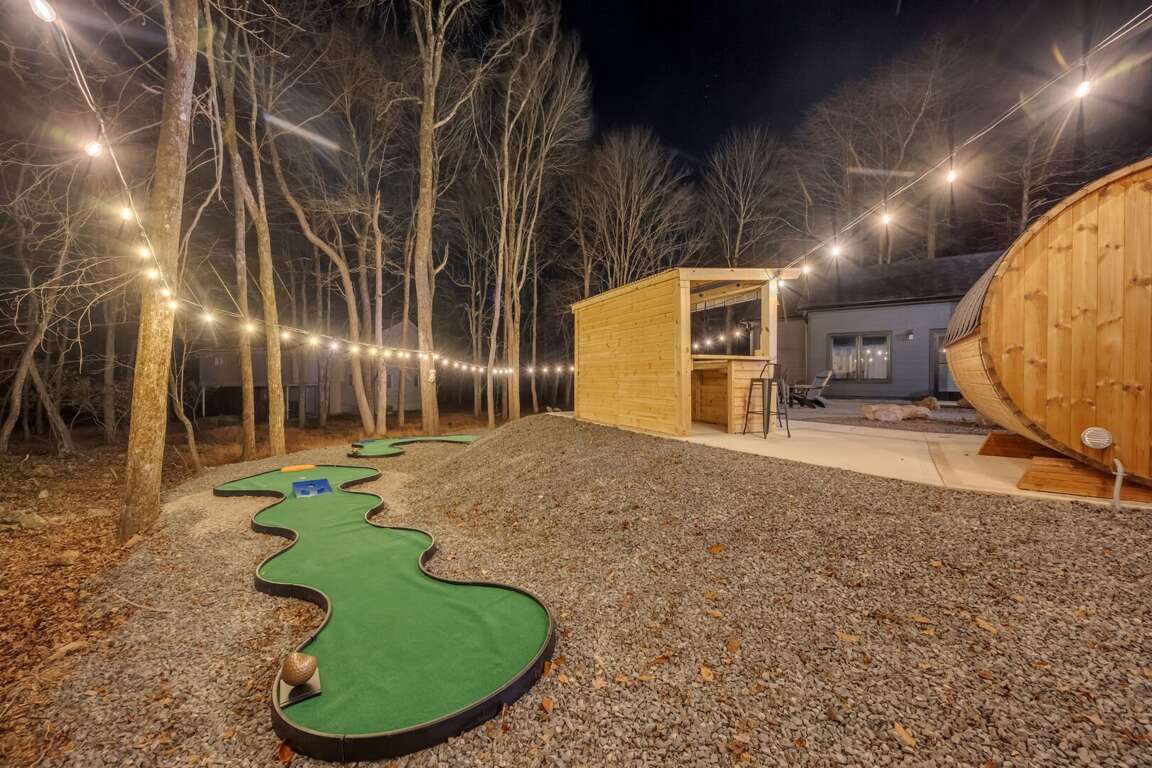 Within the game room, doors open to an enclosed pool area that flows into an amenity filled fairy-lit backyard, perfectly designed for large group gatherings. Here you’ll find an undercover hot tub, sauna, outdoor bar, dining area, firepit, and mini putt-putt course – the ultimate entertainment oasis for every season in the Poconos.