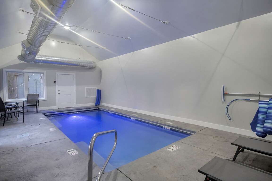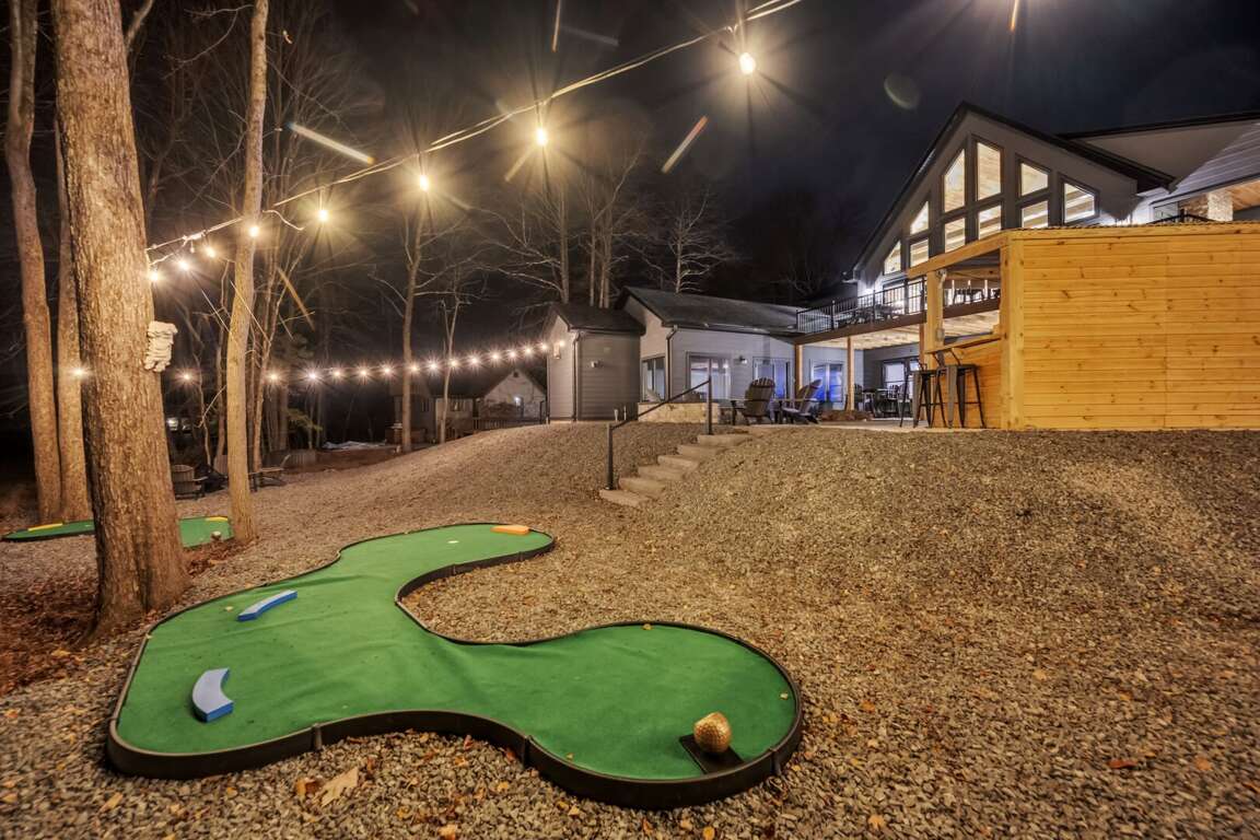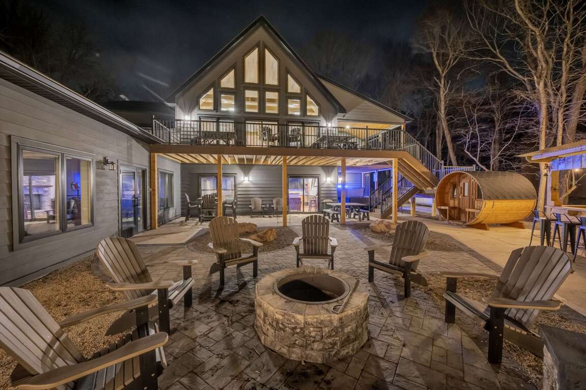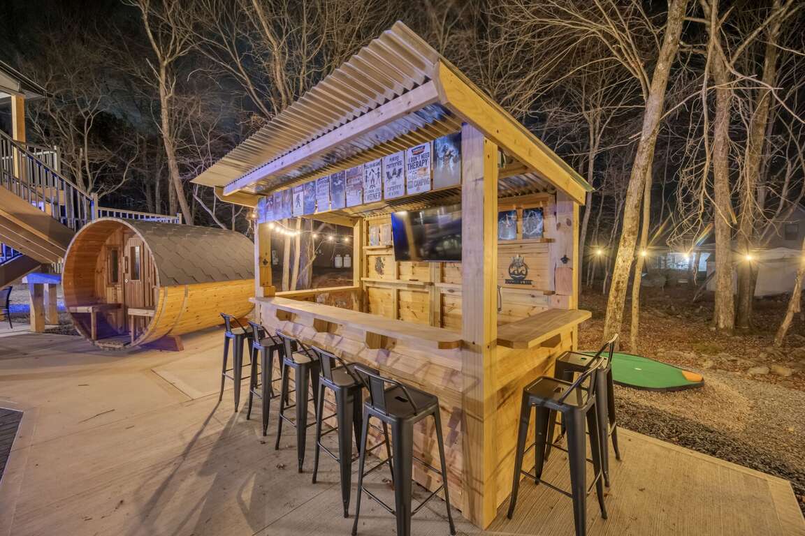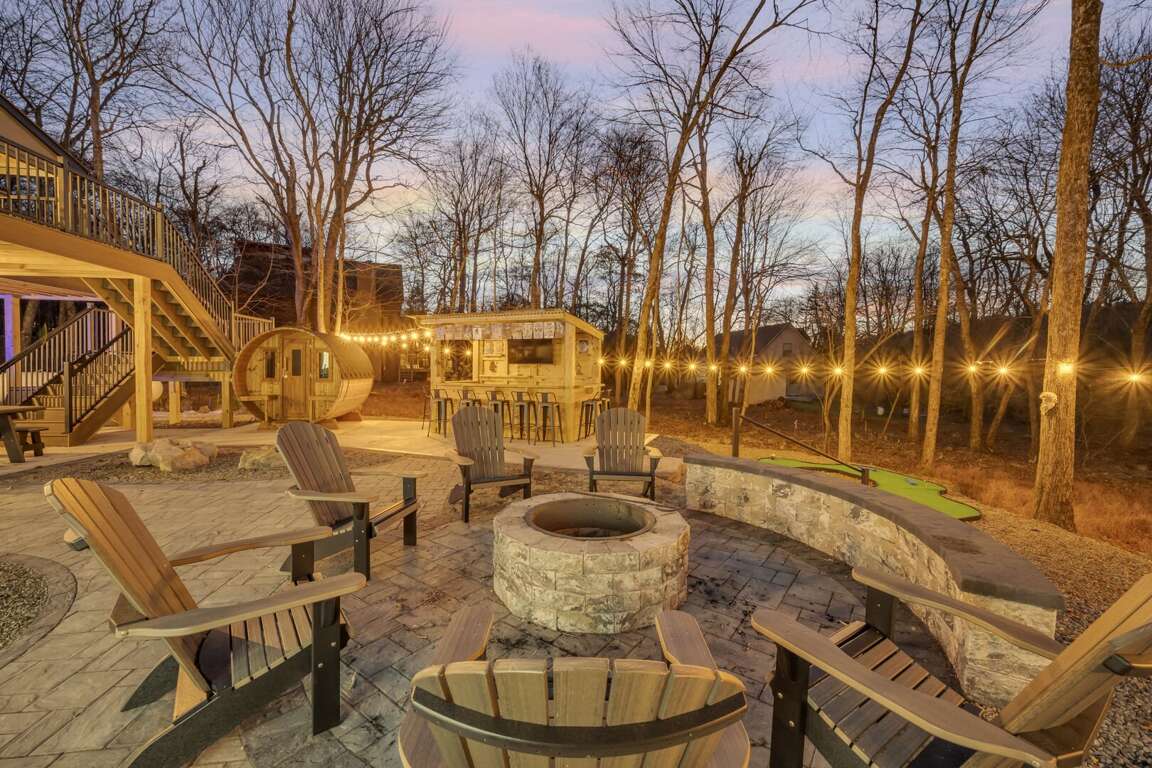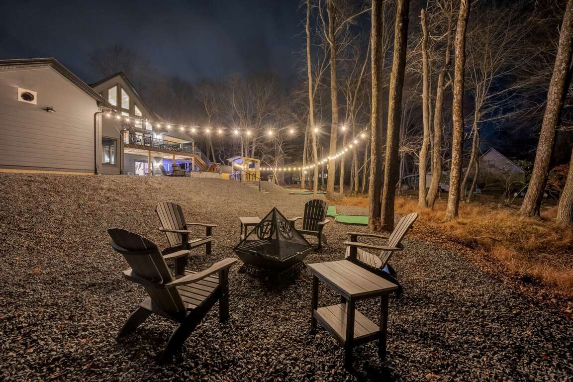 Within the game room, doors open to an enclosed pool area that flows into an amenity filled fairy-lit backyard, perfectly designed for large group gatherings. Here you’ll find an undercover hot tub, sauna, outdoor bar, dining area, firepit, and mini putt-putt course – the ultimate entertainment oasis for every season in the Poconos.