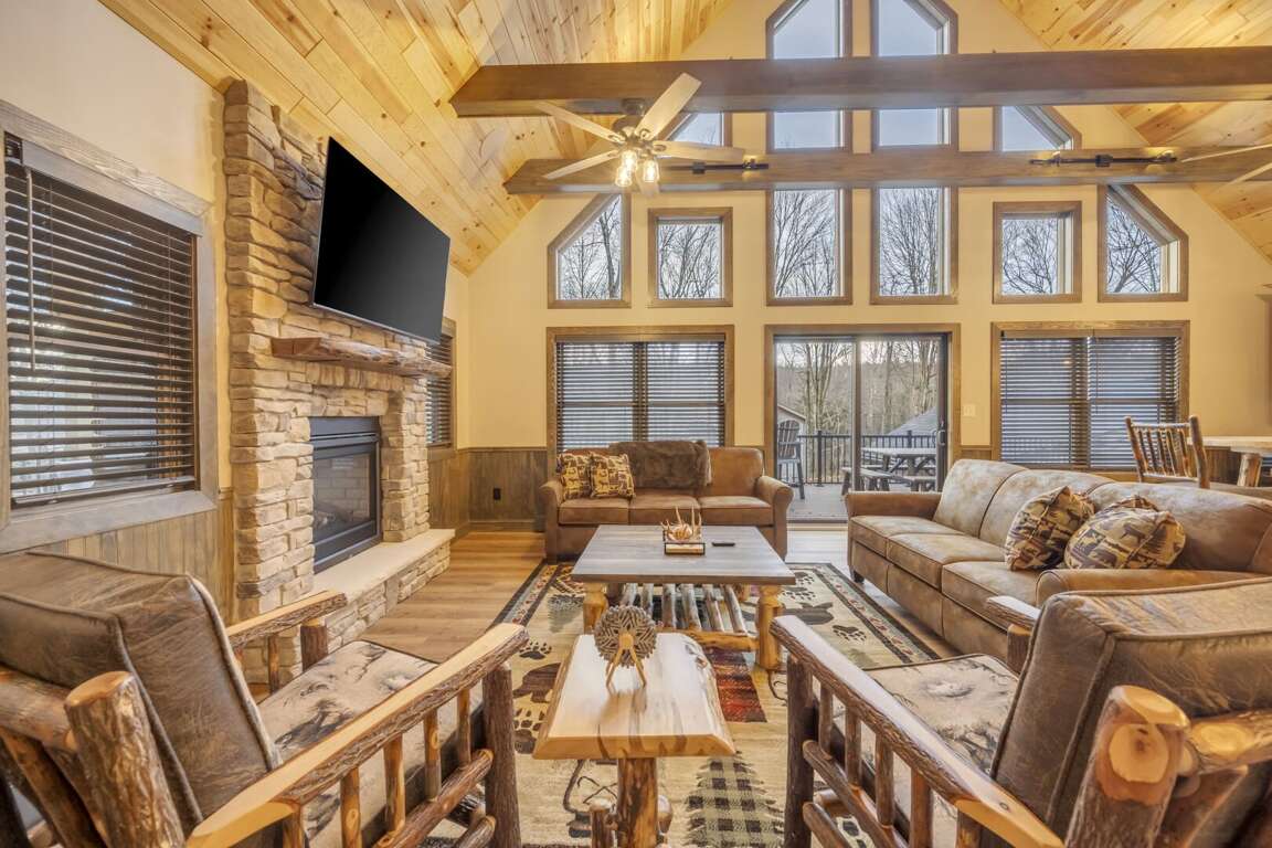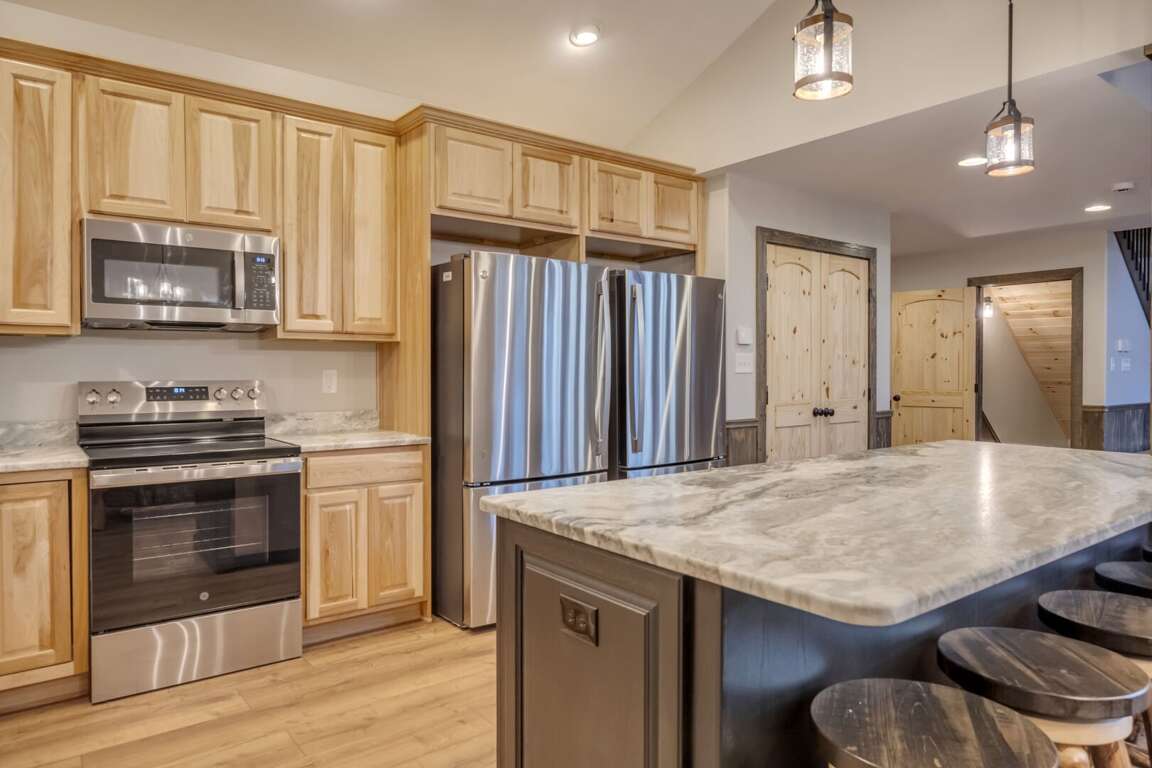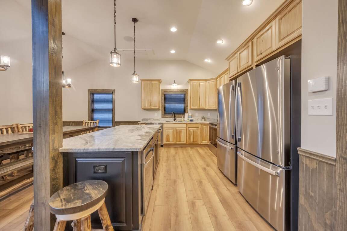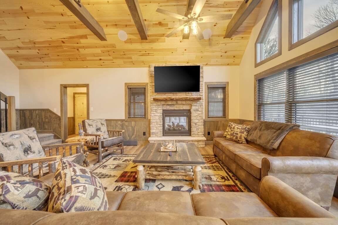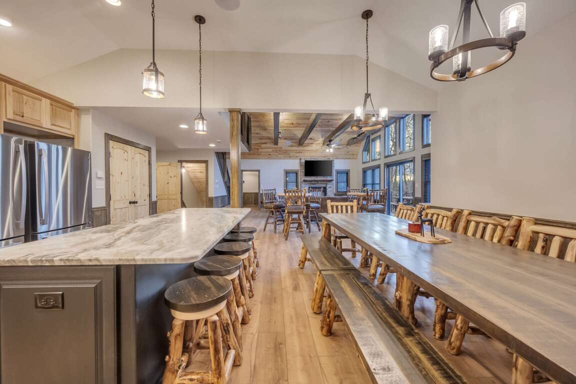 Ride the elevator or take th stairs to the second floor, where soaring cathedral ceilings create an airy, open concept living space with ample seating for group gatherings. The chef’s kitchen is fully equipped with double refrigerators and mealtimes are made easy with bar-counter seating, a large dining table, and two bistro-style tables. A separate coffee station filters the morning flow, while the great room’s welcoming gas fireplace and Smart TV invite cozy evenings in.