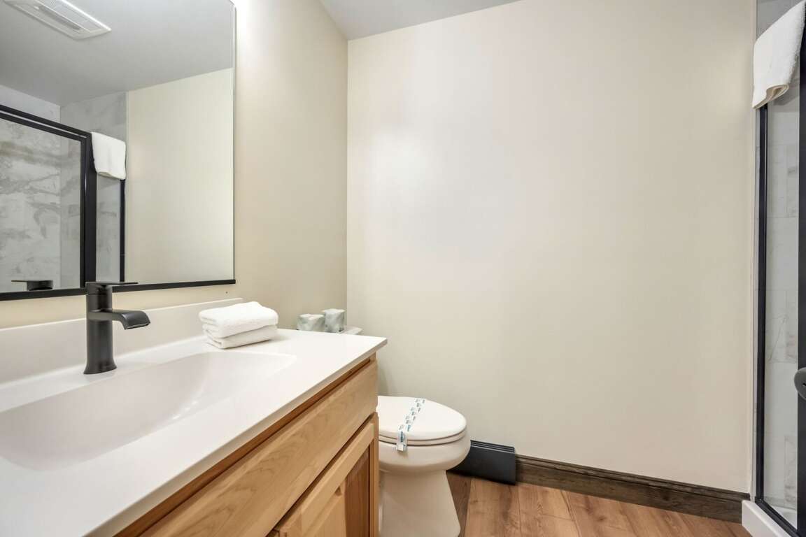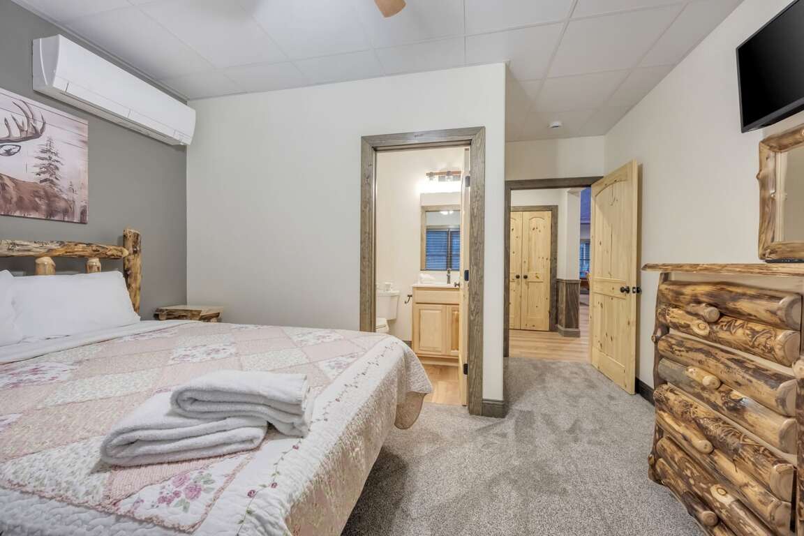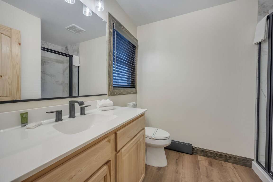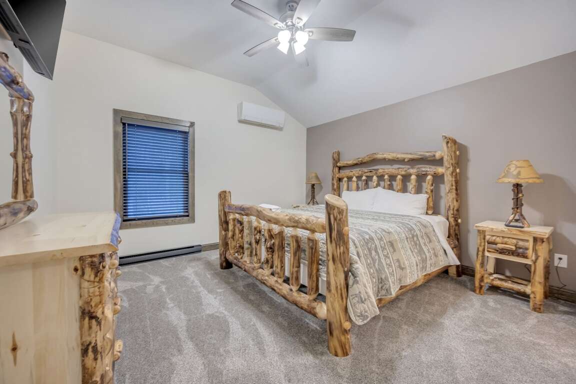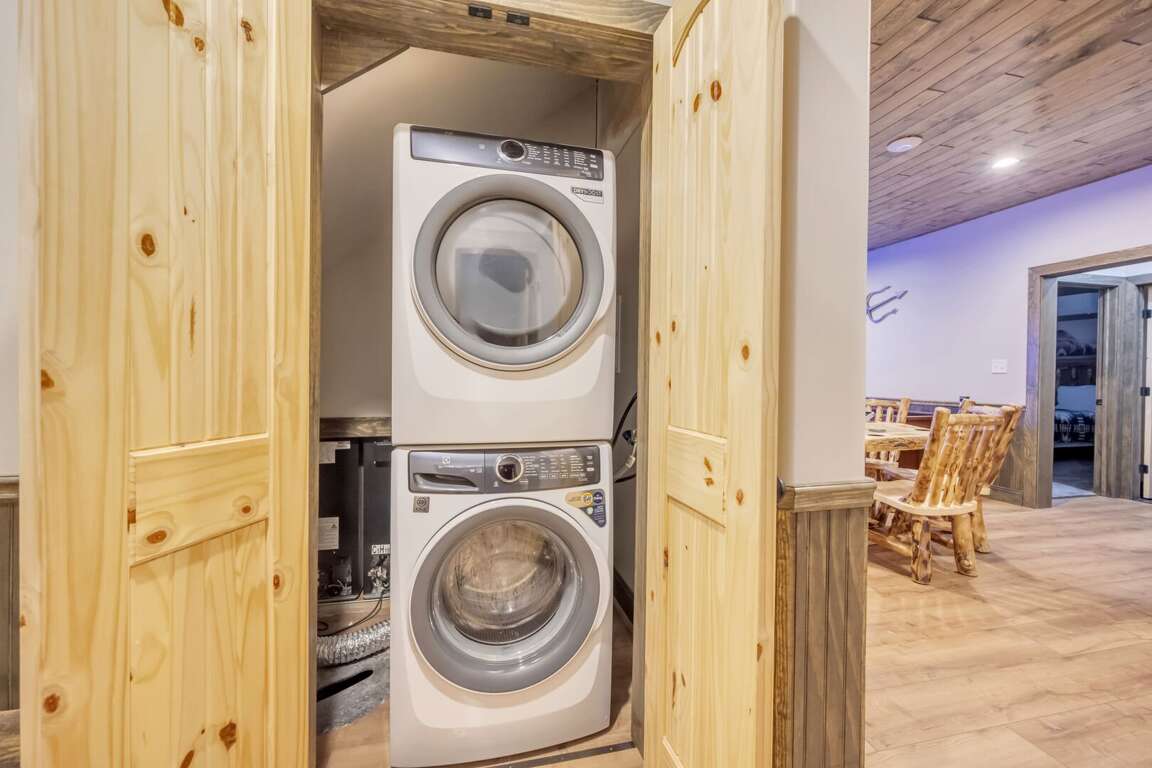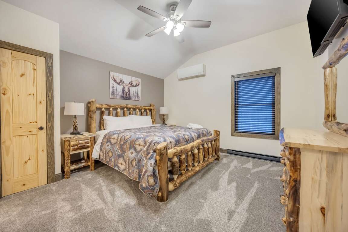 Ride the elevator or take th stairs to the second floor, where soaring cathedral ceilings create an airy, open concept living space with ample seating for group gatherings. The chef’s kitchen is fully equipped with double refrigerators and mealtimes are made easy with bar-counter seating, a large dining table, and two bistro-style tables. A separate coffee station filters the morning flow, while the great room’s welcoming gas fireplace and Smart TV invite cozy evenings in.
