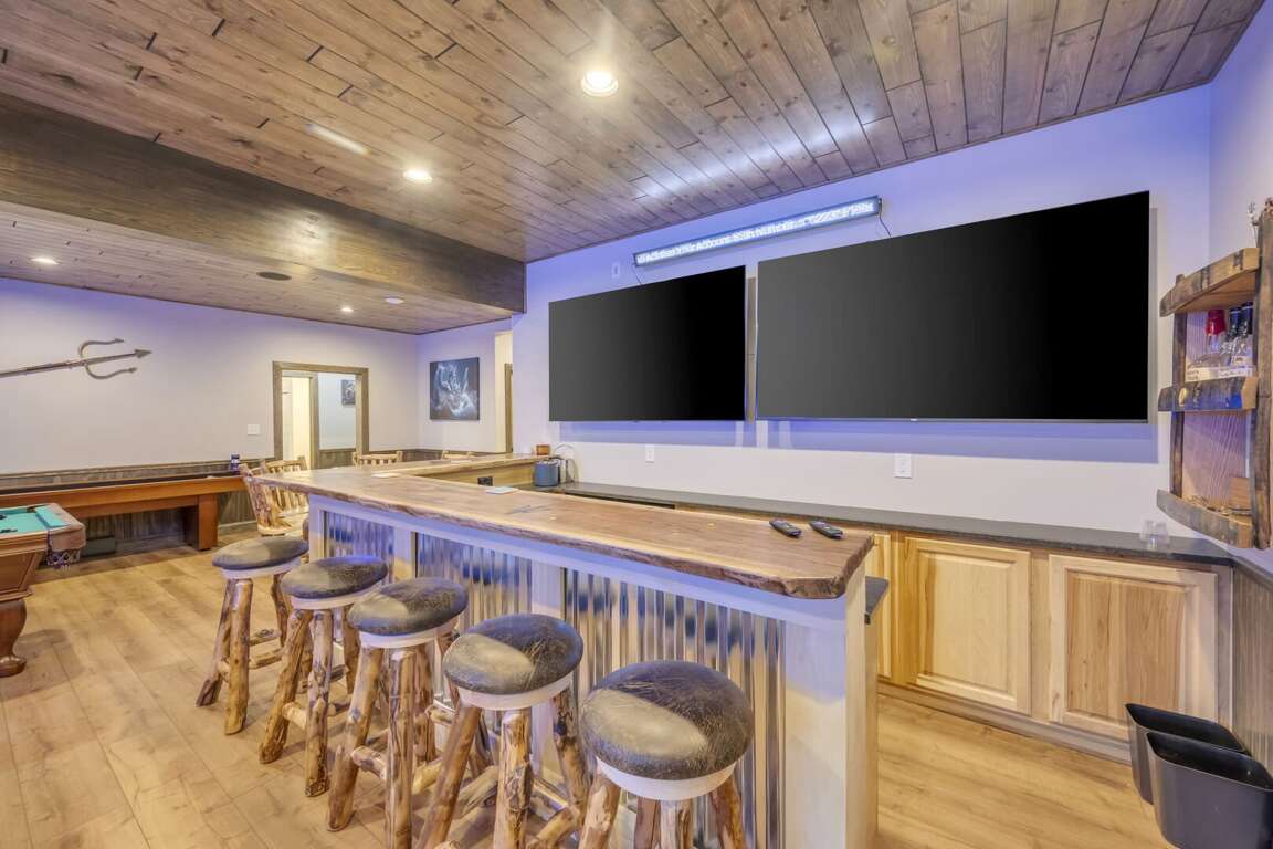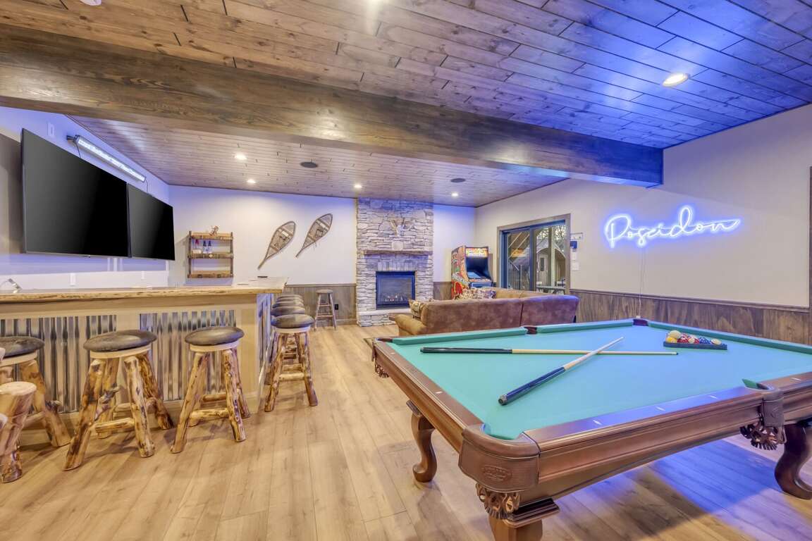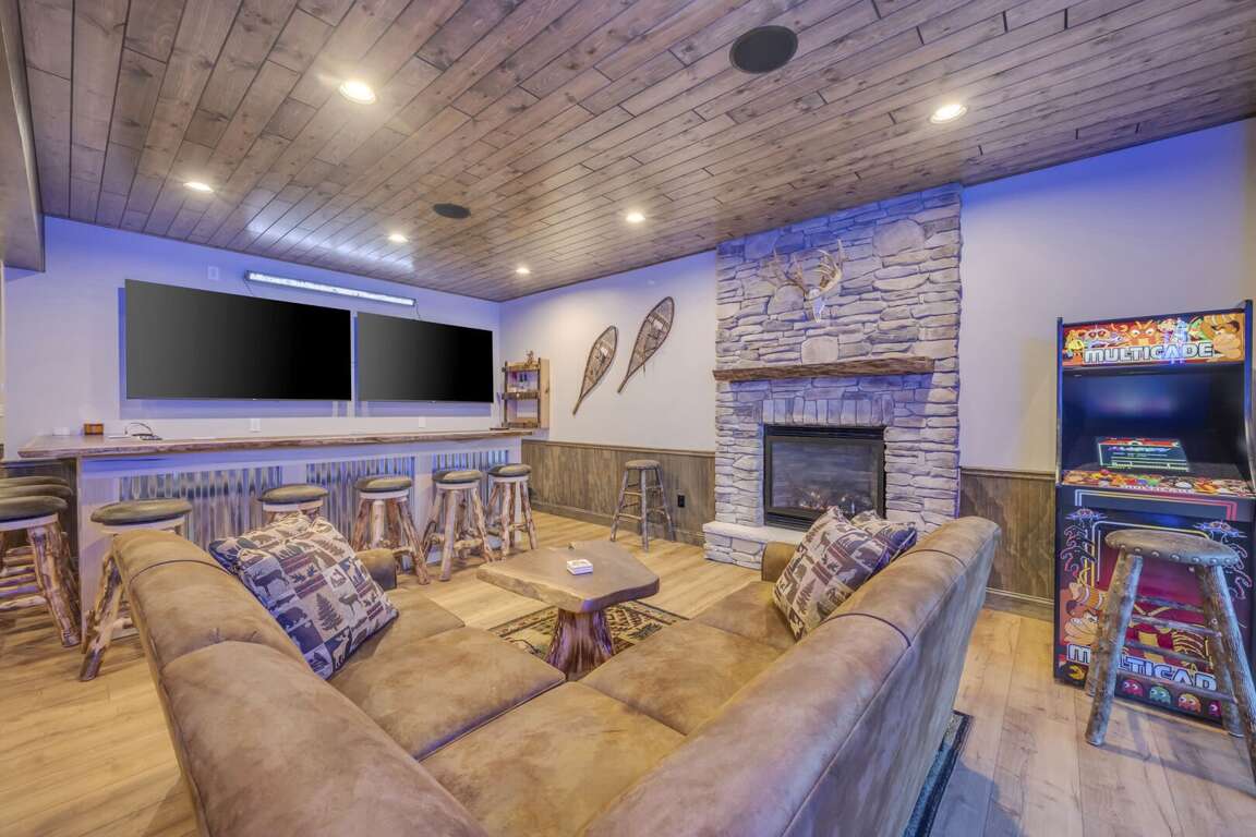 Step inside on the first floor, where the tone is set for fun and togetherness. The expansive game room invites endless play with a poker table, pool table, shuffleboard, and vintage Multicade arcade machine - all anchored by a plush sectional sofa facing a stone gas fireplace. A large bar area with two Smart TVs and a Sports Ticker with updated odds, makes it easy to enjoy sporting events, mix drinks, share snacks, stream music and movies, and unwind with friends and family.