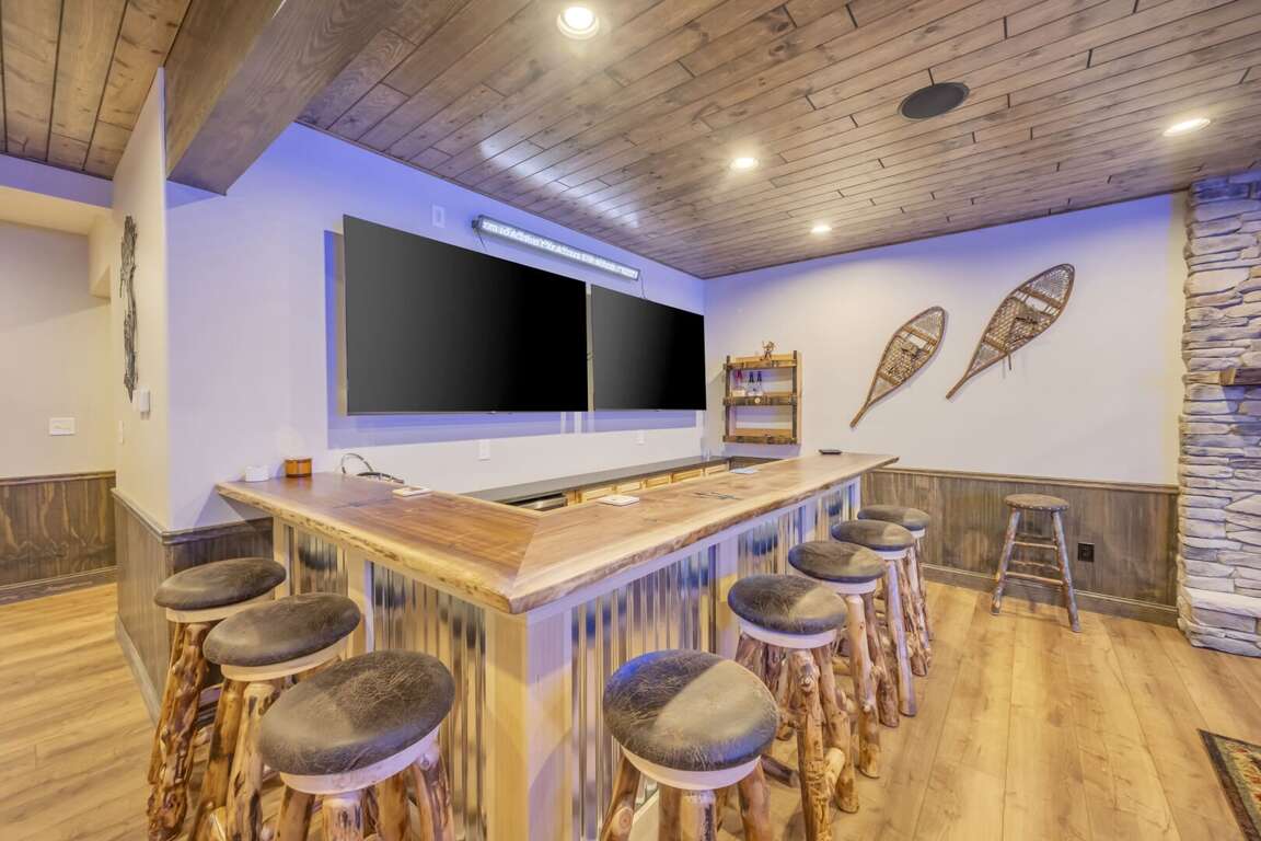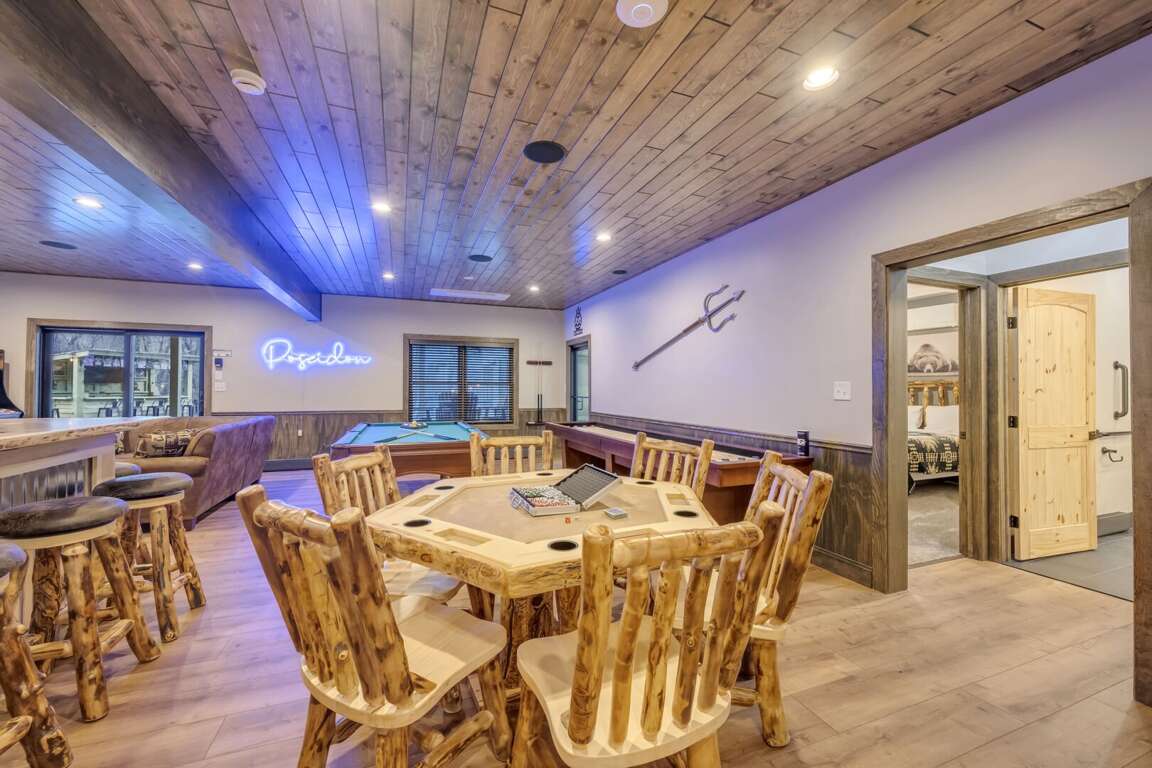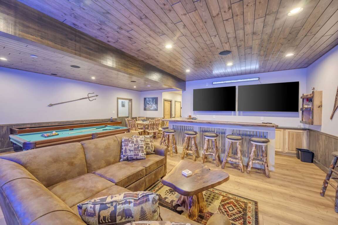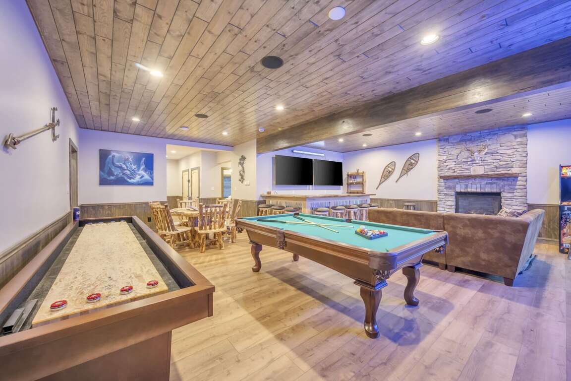 Step inside on the first floor, where the tone is set for fun and togetherness. The expansive game room invites endless play with a poker table, pool table, shuffleboard, and vintage Multicade arcade machine - all anchored by a plush sectional sofa facing a stone gas fireplace. A large bar area with two Smart TVs and a Sports Ticker with updated odds, makes it easy to enjoy sporting events, mix drinks, share snacks, stream music and movies, and unwind with friends and family.