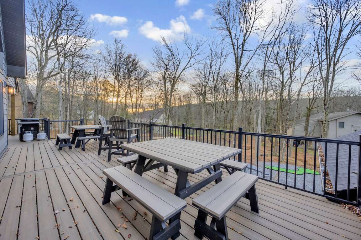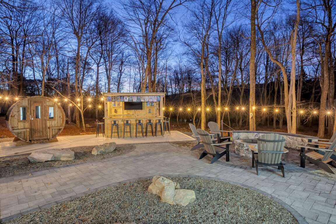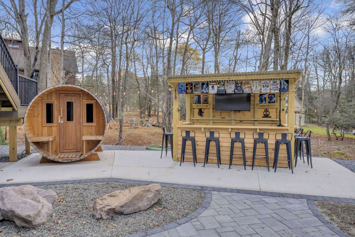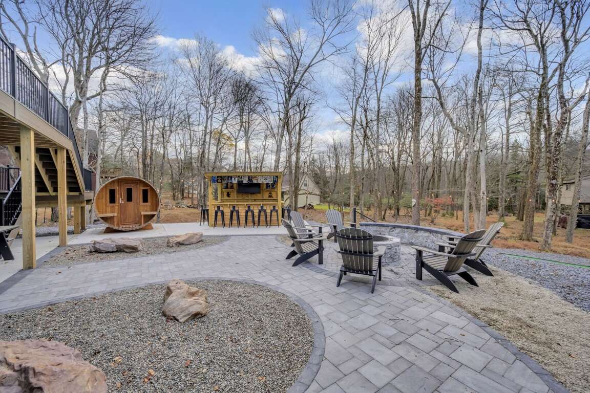 Sliders lead out to an expansive wrap-around patio overlooking the backyard complete with a BBQ grill, plenty of seating, and tranquil wooded views, the perfect spot for alfresco dining or stargazing under the Poconos sky.