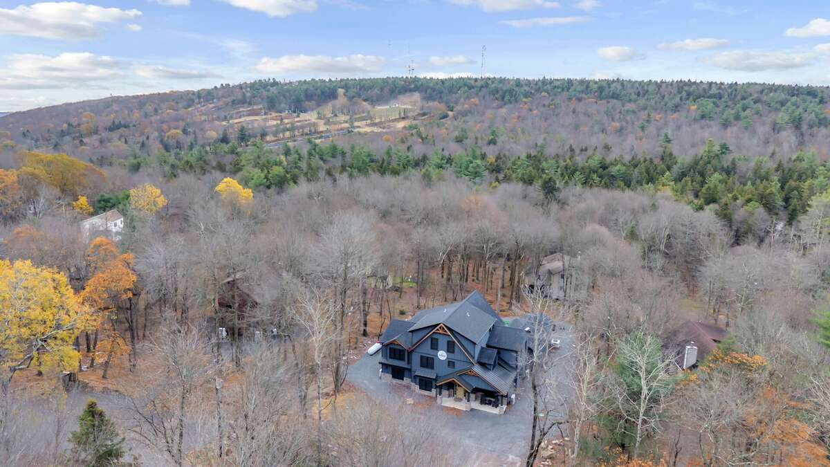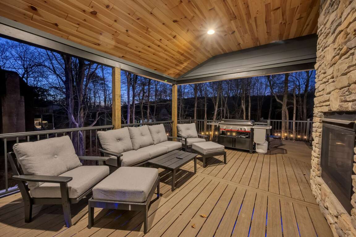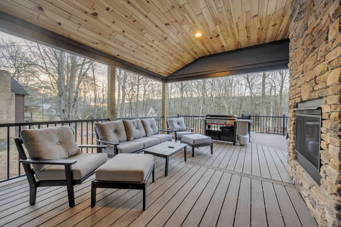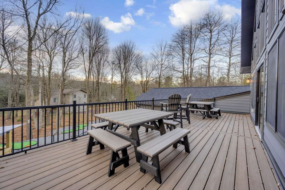 Sliders lead out to an expansive wrap-around patio overlooking the backyard complete with a BBQ grill, plenty of seating, and tranquil wooded views, the perfect spot for alfresco dining or stargazing under the Poconos sky.