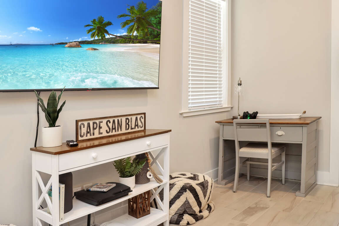 - Stylish workspace: At the top of the stairs, there is a stylish workspace where guests can catch up on work or stay connected.