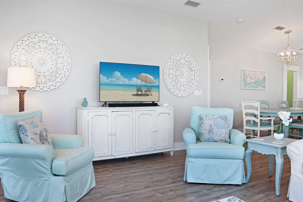 - The top-floor living room boasts incredible views of the Gulf of Mexico, creating a relaxing and inviting atmosphere.
