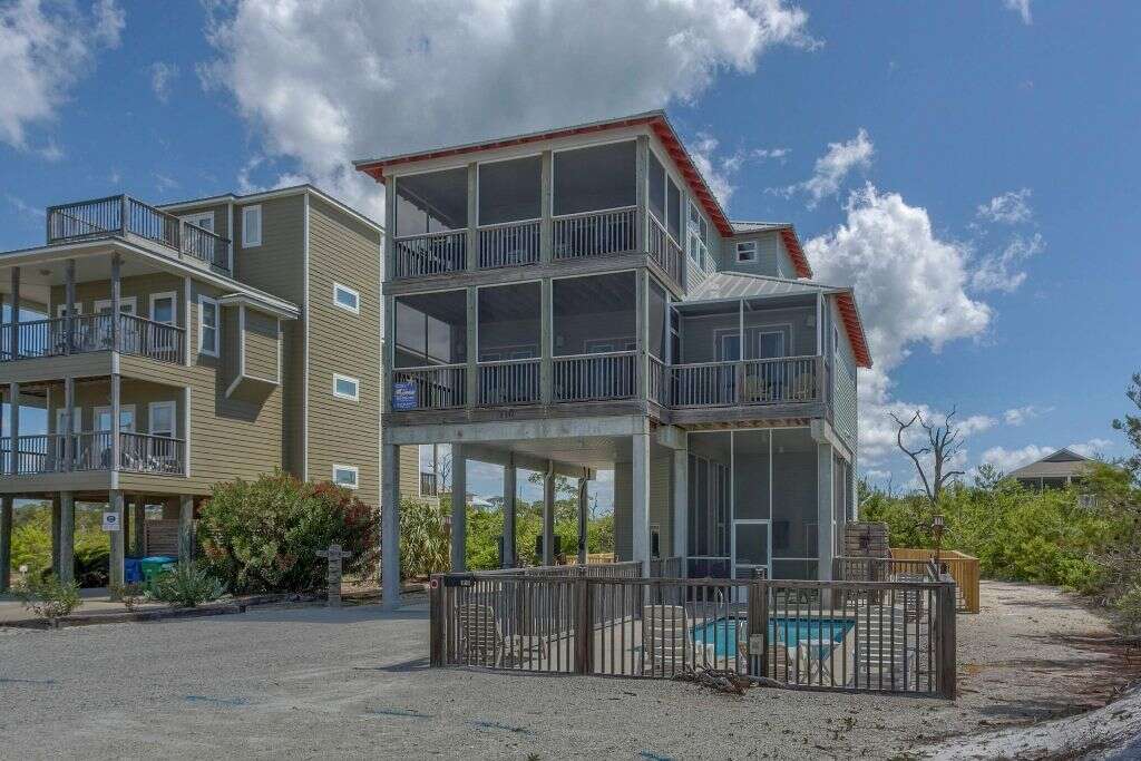 Single-family house on Cape San Blas, FL with 4 bedrooms, private pool, screened porches, elevator, and a fenced outdoor area near the shore.