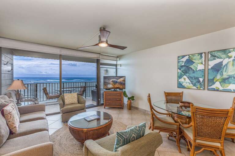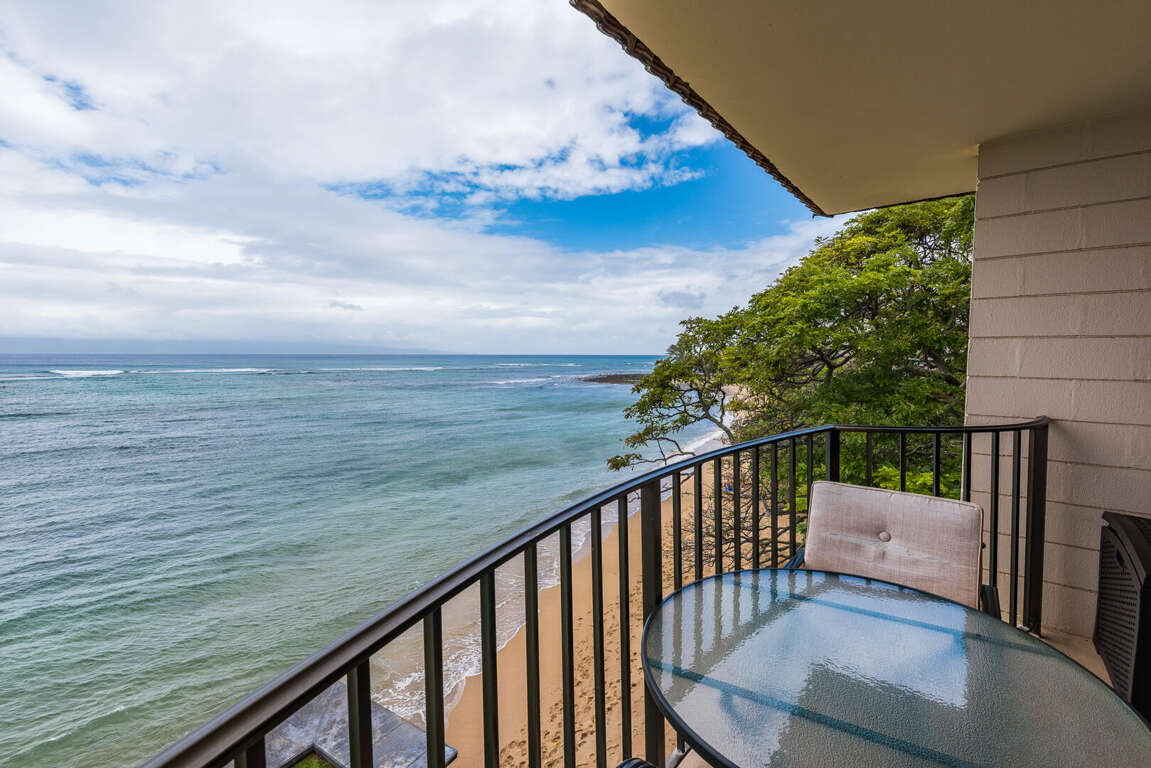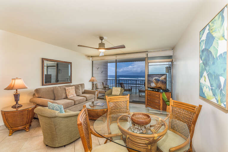 Situated on the fourth (top) floor, Kahana Reef 422 is a private corner suite with sweeping, unobstructed ocean views from your lanai, living room, and kitchen. Thoughtfully renovated and tastefully furnished, it features extra windows that welcome natural light and the refreshing cool trade winds that flow through the condo. Although there is no air conditioning, the home remains comfortable year-round thanks to ceiling fans, portable fans, and the gentle ocean breeze. For added convenience, the resort is equipped with an elevator providing easy access to this top-floor unit.<br />