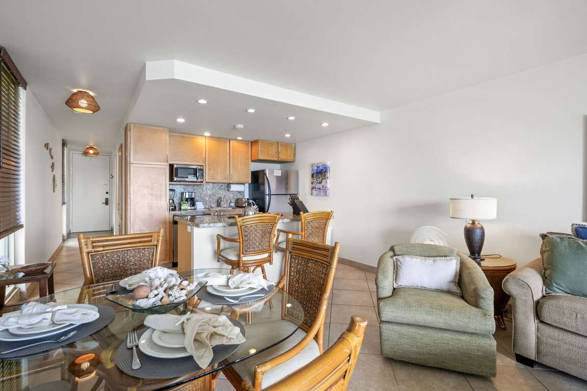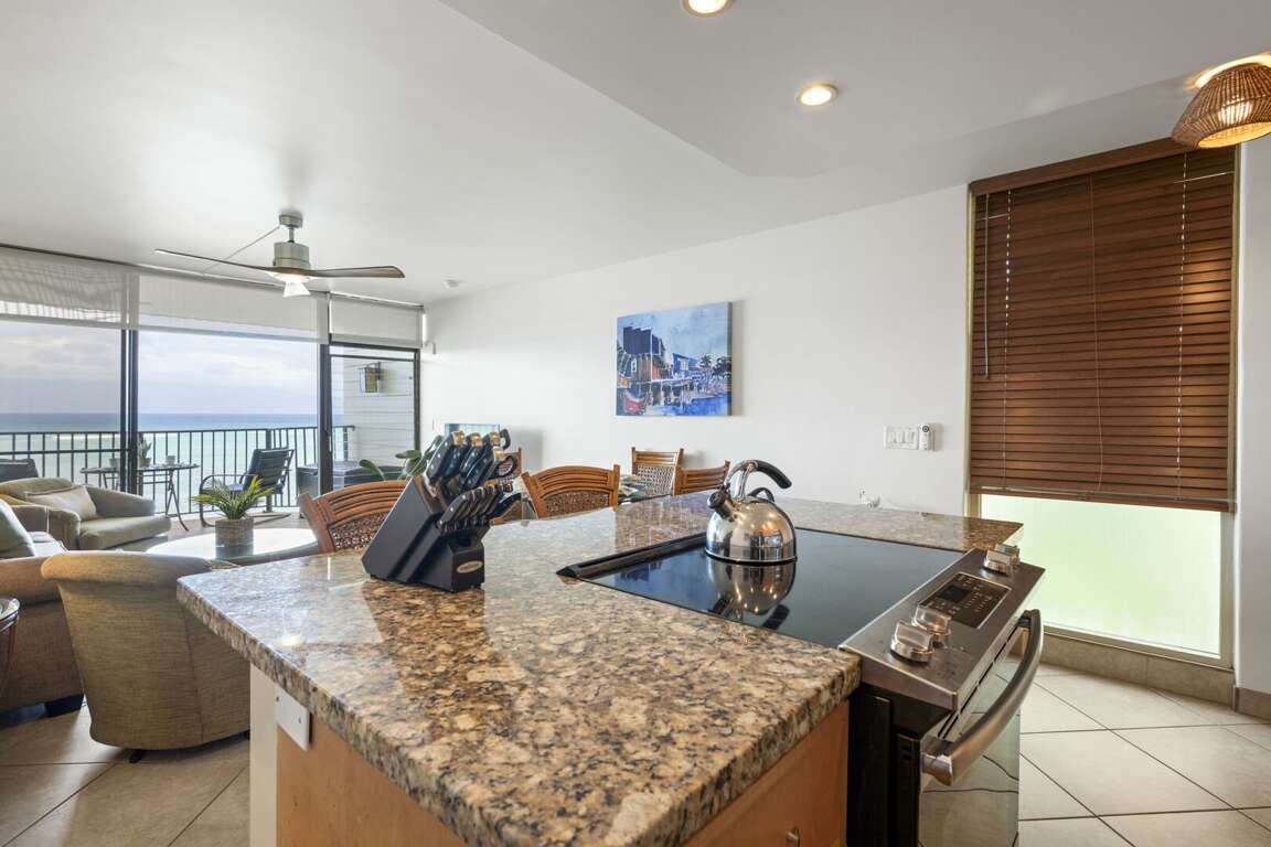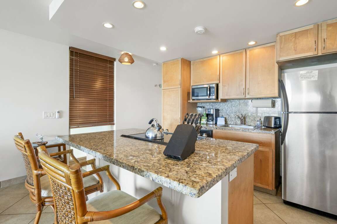 The fully equipped kitchen is a delight for any home chef, complete with full-size stainless steel appliances, granite countertops, a spacious island, and elegant tile flooring that flows seamlessly throughout. Unwind on your private lanai with morning coffee or an evening cocktail as you watch turtles glide by and whales breach in the distance (seasonally). Whether you’re here for a romantic getaway or a peaceful oceanfront retreat, Kahana Reef 422 offers everything you need for an unforgettable stay in paradise.<br />