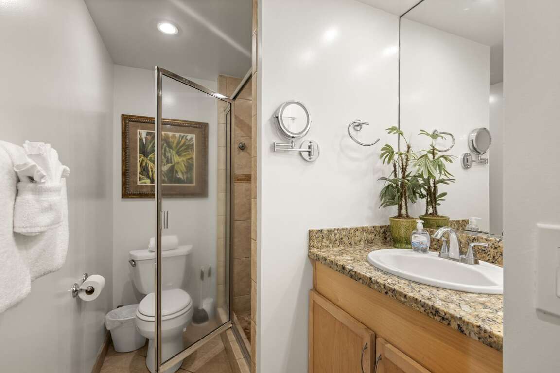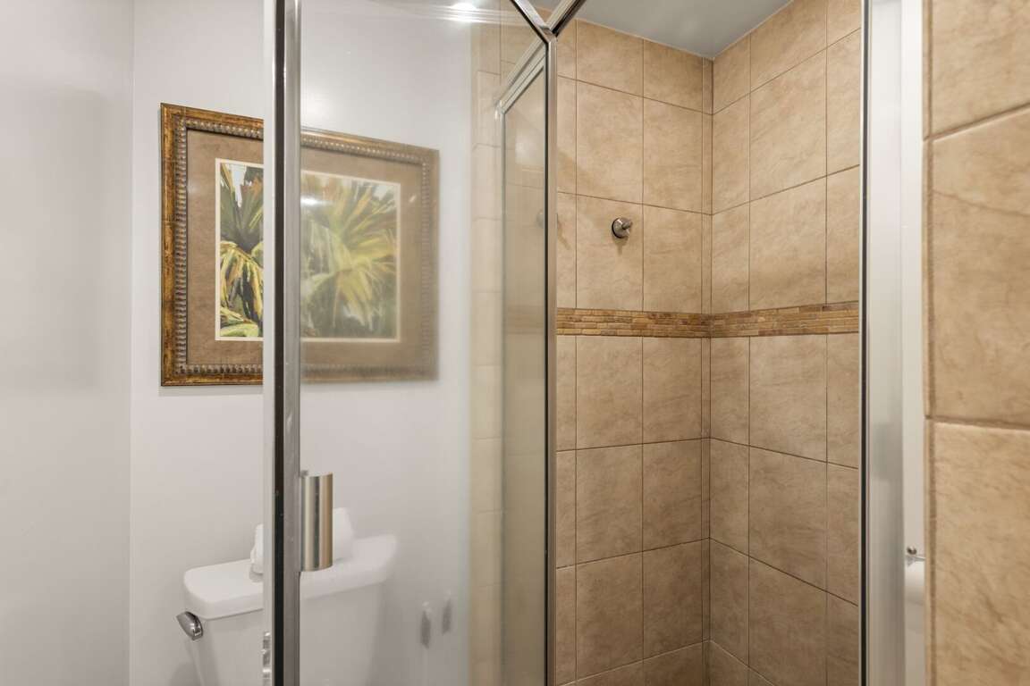 The bedroom features a new king-size bed for restful nights, while the living room includes a comfortable queen sleeper sofa for additional guests. The modern bathroom features a large walk-in shower with glass doors and a granite vanity, adding a touch of luxury.<br />