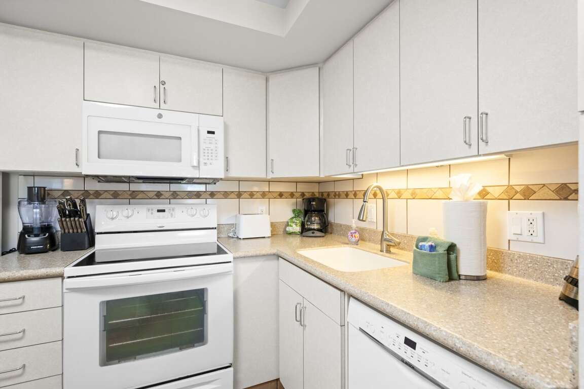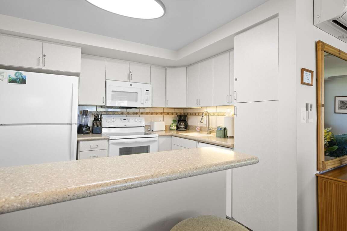 Enjoy preparing meals at home with a fully equipped kitchen with counter space to prepare meals while socializing and taking in the ocean views. Kitchen amenities include olive oil, salt & pepper, blender, coffee maker, toaster, and tea kettle. Full-sized oven, refrigerator, and dishwasher keep things simple for the chef. With the thoughtfully open concept, the cook will enjoy everyone's company. The living room offers a queen-size sofa bed for additional guests, kick your feet up and relax in the recliner chair, and a flatscreen TV, along with Wi-Fi to keep you connected. Your choice to dine indoors or al fresco on your lanai - both with an ocean view! The bedroom is divided from the living room by a sliding pocket door for privacy. Enjoy the spacious king bed, TV, and control the room's split A/C system that is independent from the living area, plus a built-in safe for added security. The shared bathroom features a large vanity with a sink-to-ceiling mirror and a step-in shower. Pack light! This unit features a stacked washer and dryer for added convenience.<br />