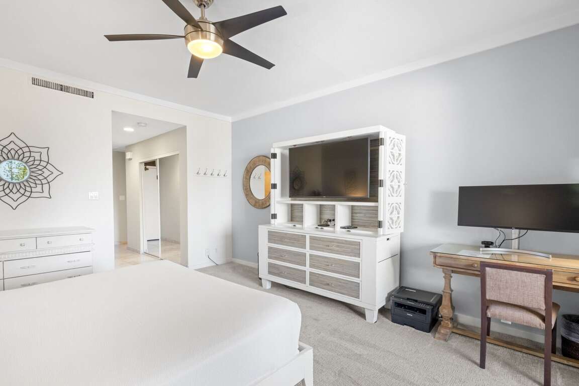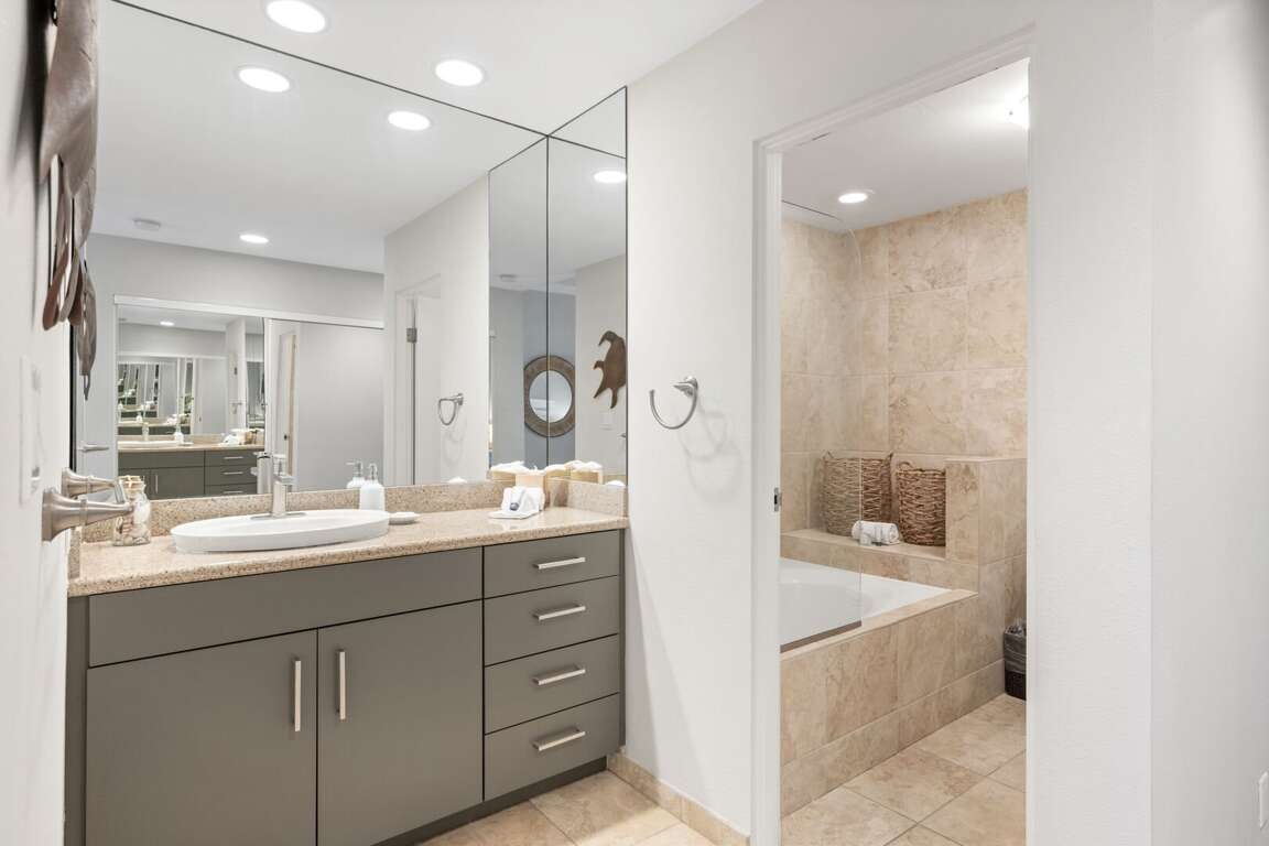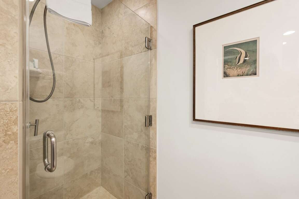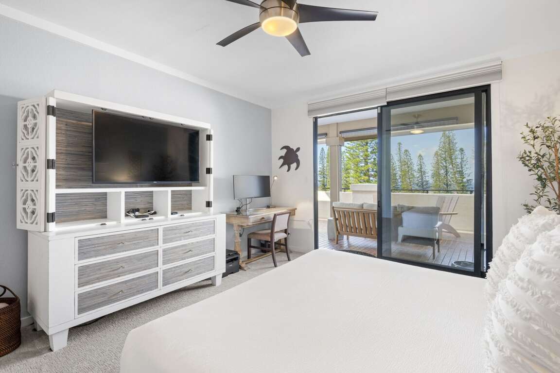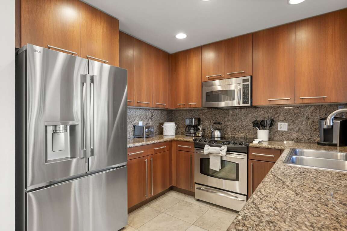 The primary suite is a serene sanctuary featuring a king-size bed dressed in luxury linens, a 55” LED HDTV, and direct lanai access for those unforgettable Maui mornings. The ensuite bathroom is beautifully appointed with granite dual vanities and a tiled tub-shower combination for a spa-like experience. A second full bathroom, complete with a walk-in shower and granite finishes, provides added privacy and convenience—ideal for couples or guests using the queen-size sleeper sofa in the living room.<br />