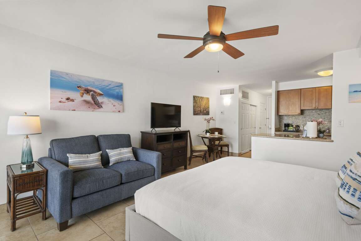 Welcome to Lahaina Shores 421—a beautifully appointed oceanfront studio on the 4th floor, designed for comfort and relaxation. Perfect for two guests, this retreat features central air conditioning, a brand-new platform bed with a firm and supportive king mattress, a cozy loveseat, stylish kitchen stools, and tropical-inspired artwork that sets the island mood. Step onto your private lanai and soak in breathtaking views of the sparkling Pacific Ocean and the neighboring island of Lānaʻi. Whether you’re savoring your morning coffee or unwinding with an evening meal, the backdrop is unforgettable. Inside, enjoy modern conveniences including a smart TV with cable, complimentary Wi-Fi, and a fully equipped kitchen stocked with everything you need to prepare your favorite island-inspired meals.<br />