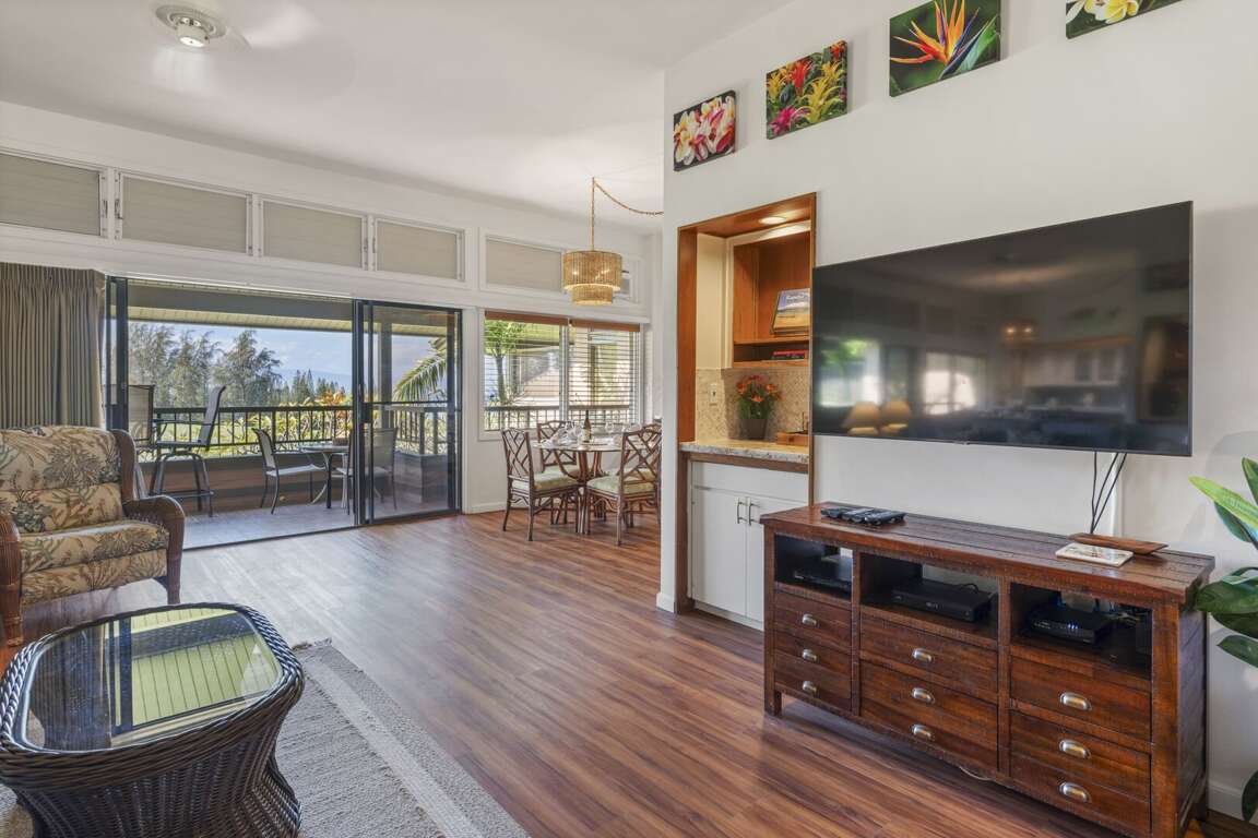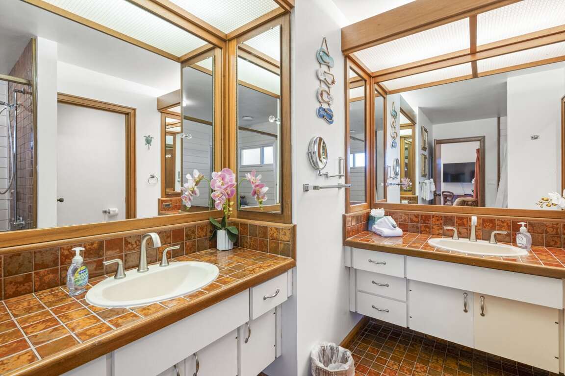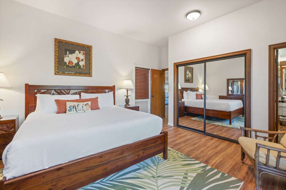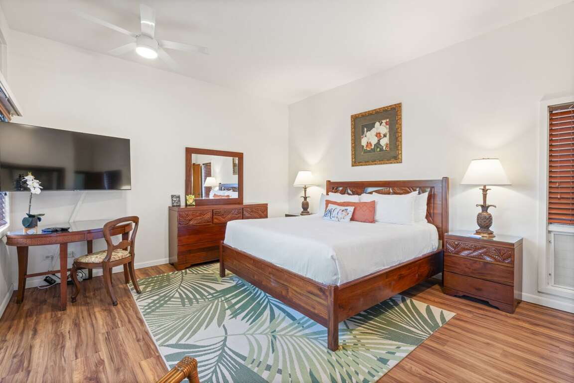 Wake up to island breezes in the private bedroom, featuring a plush king-size bed, desk, and flat-screen TV—ideal for relaxing after a sun-filled day. Ample closet space, a private lanai, and an ensuite bathroom add to the comfort and privacy. The ensuite bath is a true retreat, complete with a large soaking tub with optional shower head, dual sinks, and generous storage. A second full bathroom offers a step-in shower and a convenient washer and dryer, perfect for guests who like to travel light.<br />