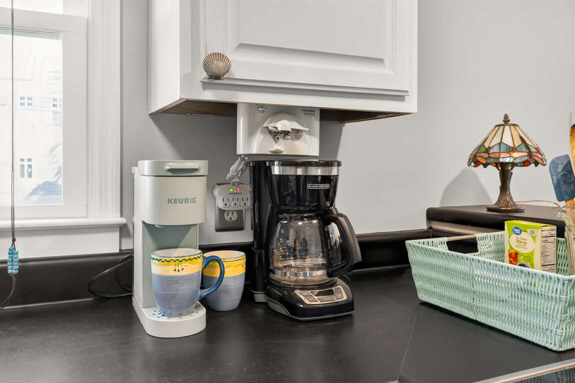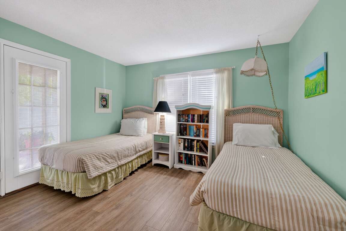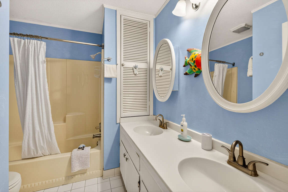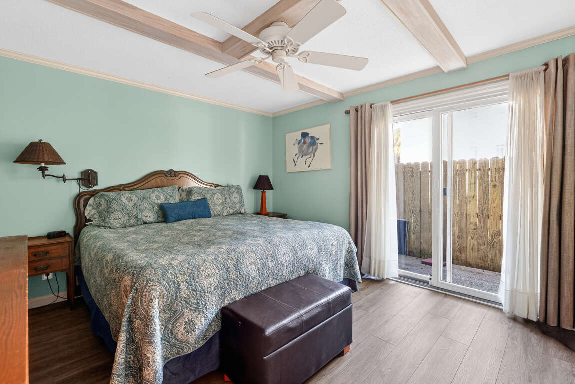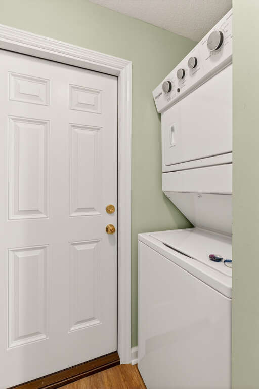 The first floor has two bedrooms, a full bath and washer/dryer. Bedroom #1 is on the left - with a King-sized bed and TV. On the right you'll find a blast of sunshine in Bedroom #2 - with a set of twin beds and a door opening up to the private courtyard area. There is one full bathroom downstairs with a tub/shower combination and a stack-able washer/dryer unit.