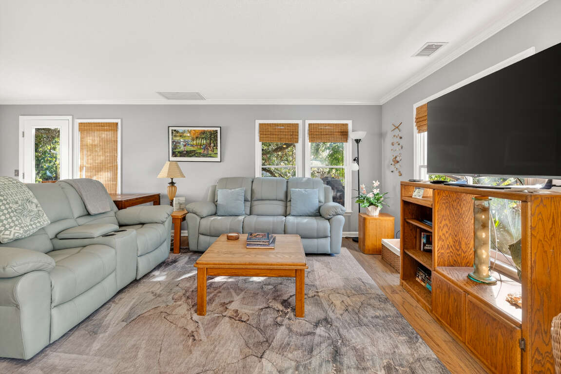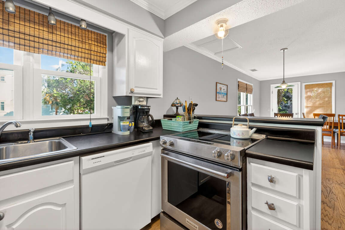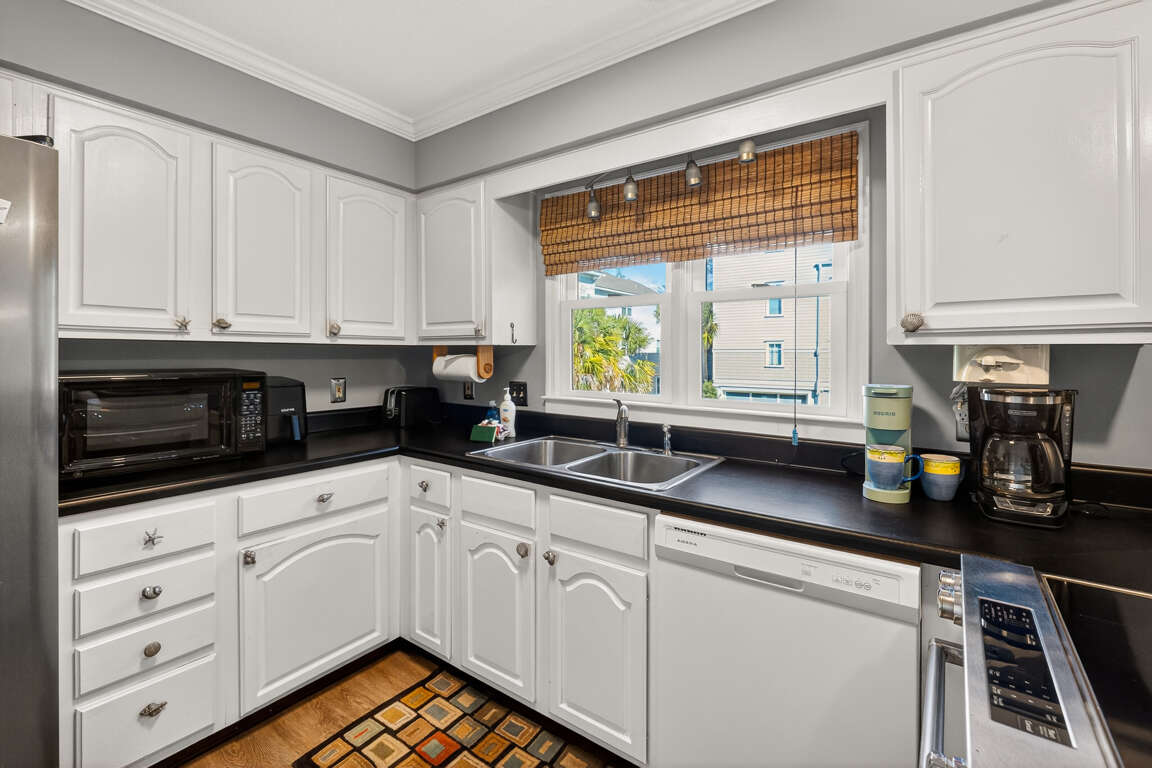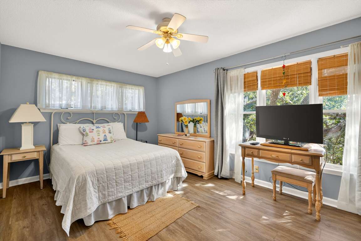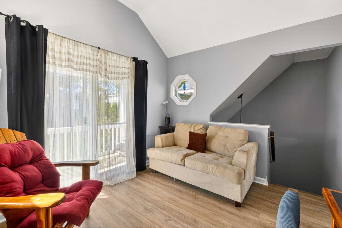 The second floor of this classic beach house is where you will find the kitchen, living room and dining area. Hardwood flooring, lots of windows and light-colored furniture make this a great gathering place. The kitchen is equipped with standard amenities. There is plenty of seating for your crowd - either at one of the tables or the kitchen bar. TV in the living room. A half-bathroom is also located on this level. There is a screen porch located off of the front of the house from the 2nd floor and a deck area off the dining room.