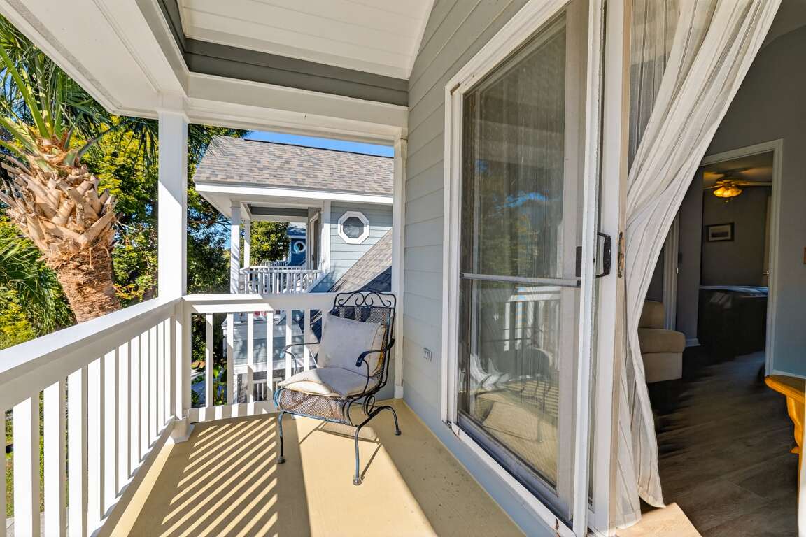 The 3rd Floor has 2 more bedrooms, each with a Queen bed and en-suite bathroom with tub/shower combination. Rounding out the area is a lounge area and another sun porch access. The bedroom on the right is equipped with a TV.