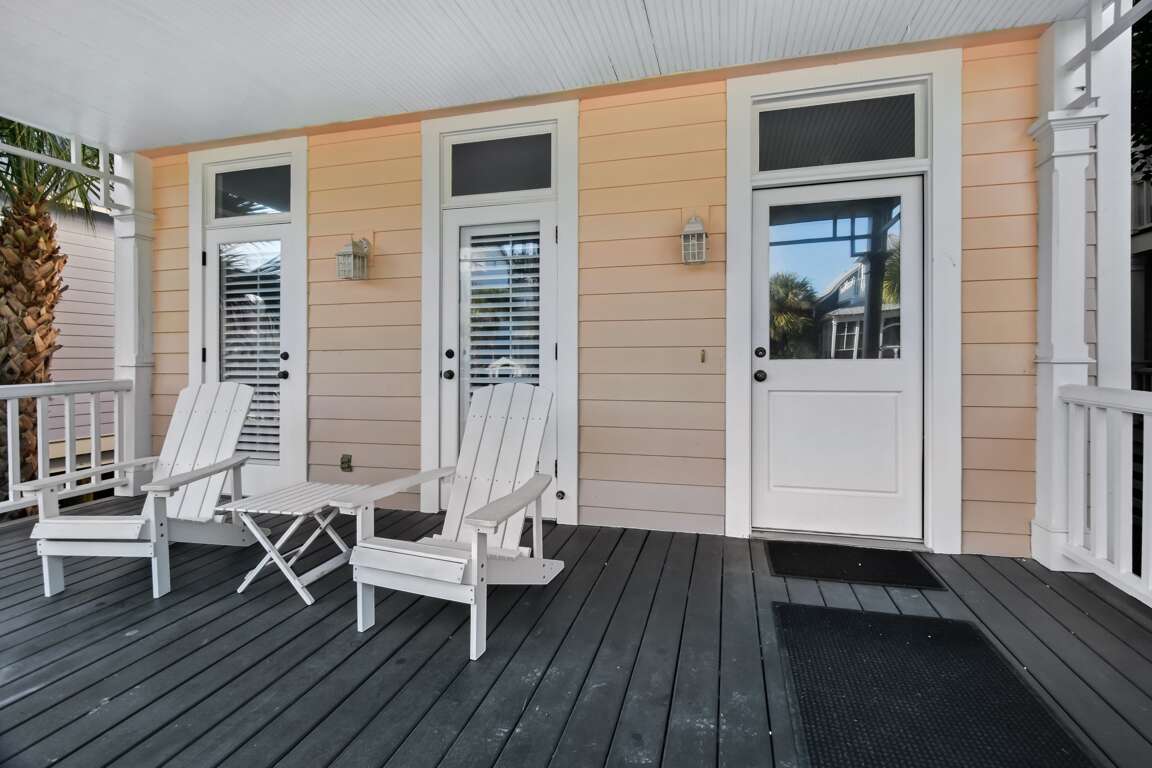 Two parking spaces are provided directly in front your cottage. The walkway leads up seven steps to the porch on the first floor, which has two lounge chairs and a table.