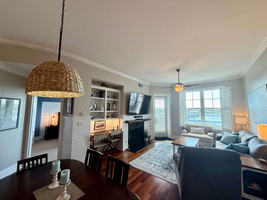 Enjoy the views of the island from the fully equipped kitchen, the dining area, and the living room. There is also a large balcony that separates the master bedroom from the living area. Each morning, enjoy the sunrise on the island and each evening, the sun setting over the boats in the harbor.