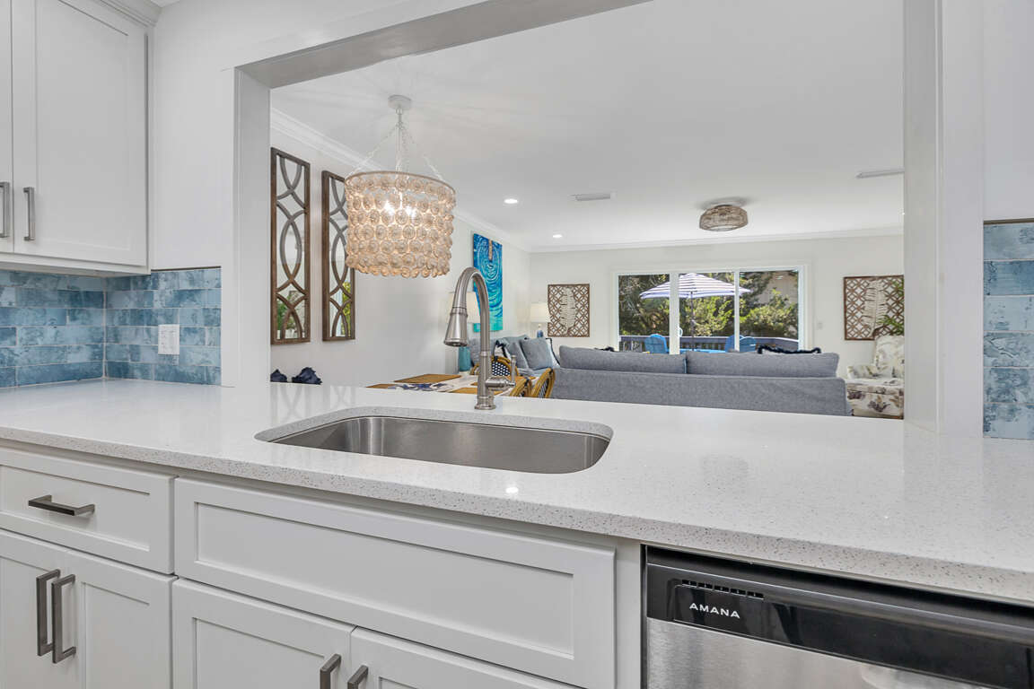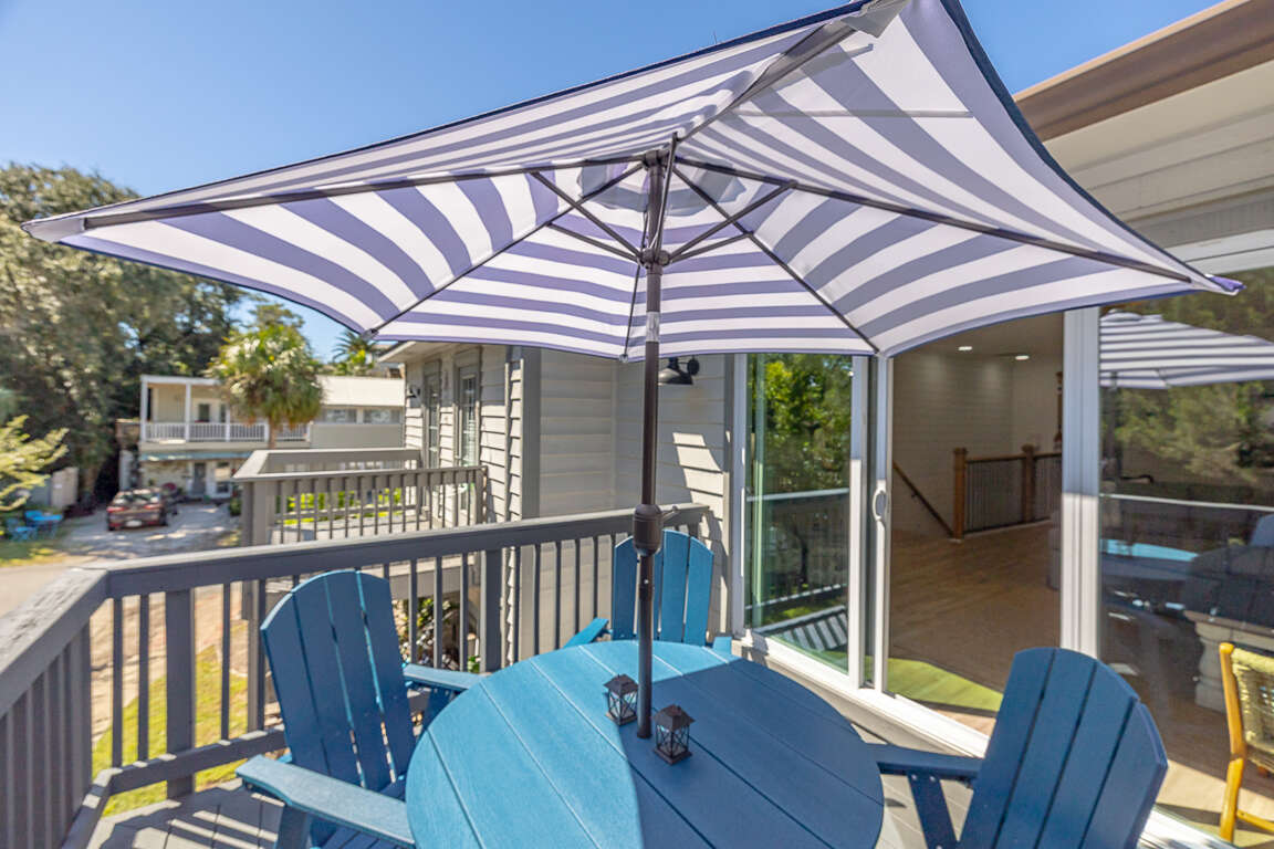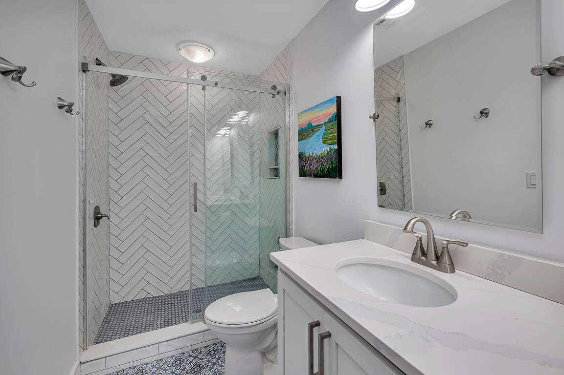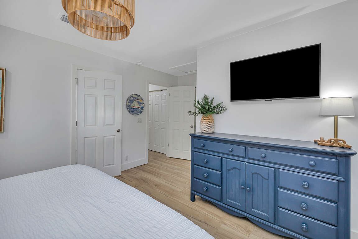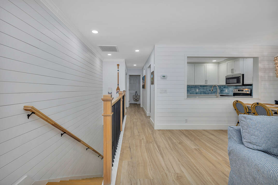 The second level features a well-equipped kitchen with new stainless steel appliances, quartz countertops and new cabinets, which opens up to a great living room/dining room/entertainment area. From the living room you will have sliding glass door access to the newly enlarged deck with table seating for four and a chaise lounge. You have a partial ocean view from the deck. The master bedroom upstairs boasts a king sized bed with a smart TV. The upstairs bathroom, with new everything, has a double vanity and walk in shower.
