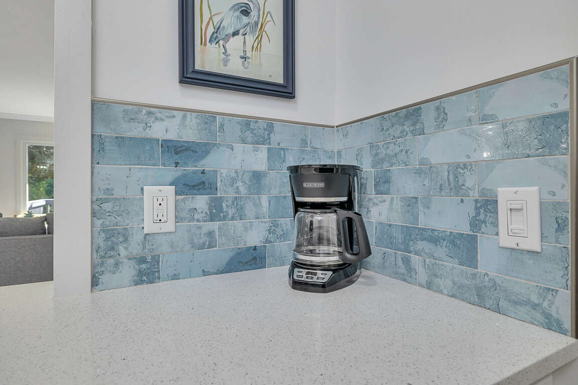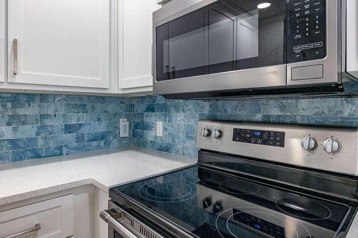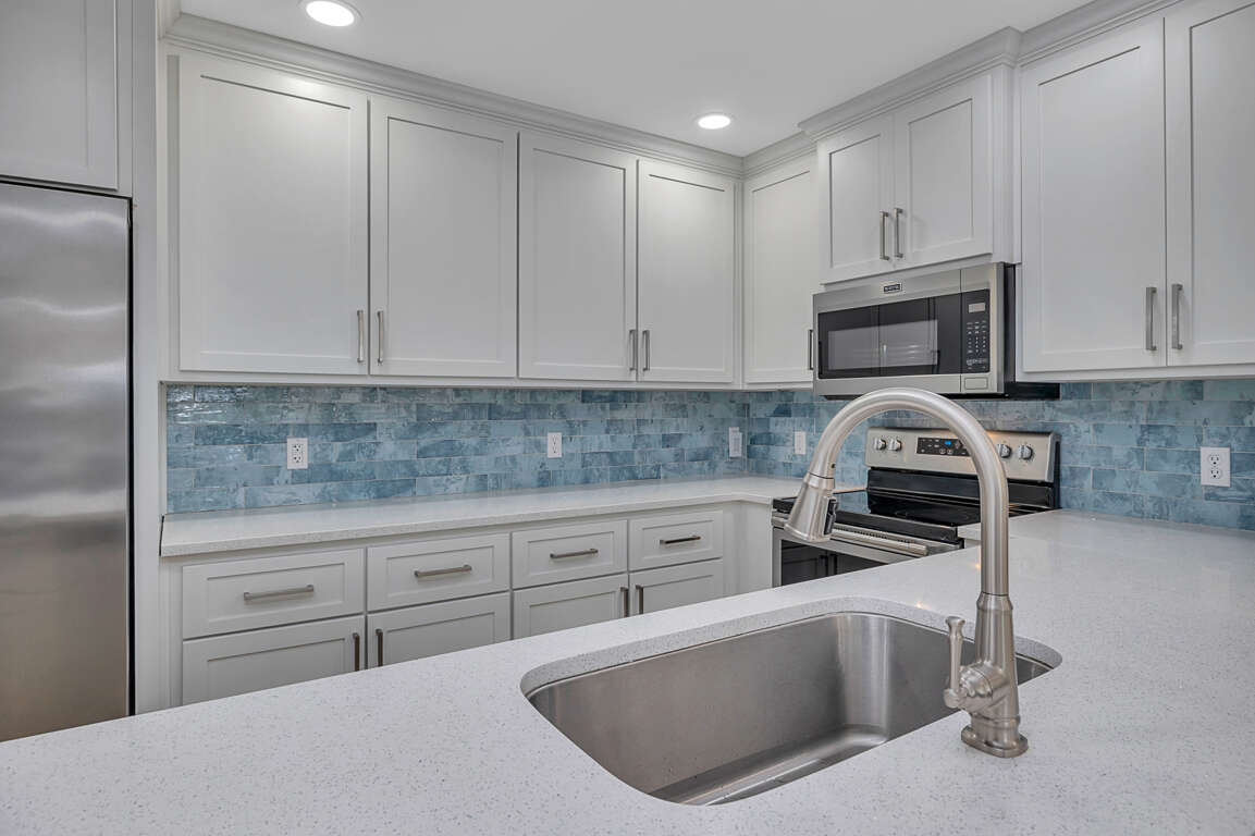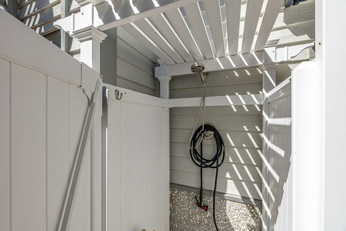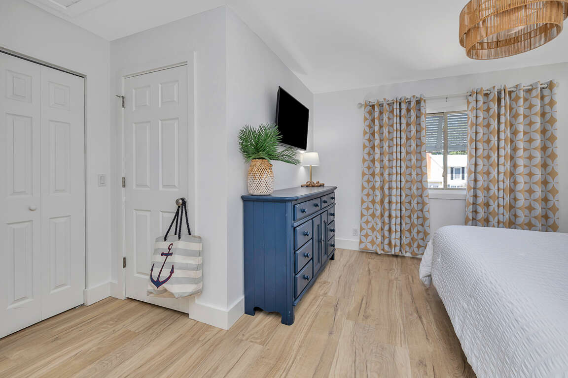 The second level features a well-equipped kitchen with new stainless steel appliances, quartz countertops and new cabinets, which opens up to a great living room/dining room/entertainment area. From the living room you will have sliding glass door access to the newly enlarged deck with table seating for four and a chaise lounge. You have a partial ocean view from the deck. The master bedroom upstairs boasts a king sized bed with a smart TV. The upstairs bathroom, with new everything, has a double vanity and walk in shower.