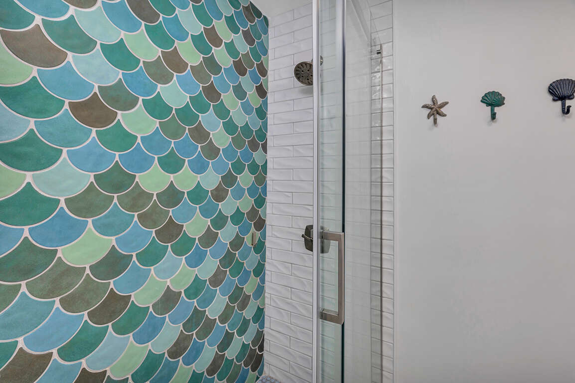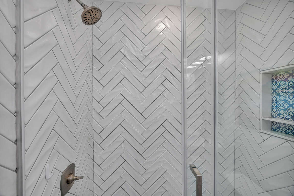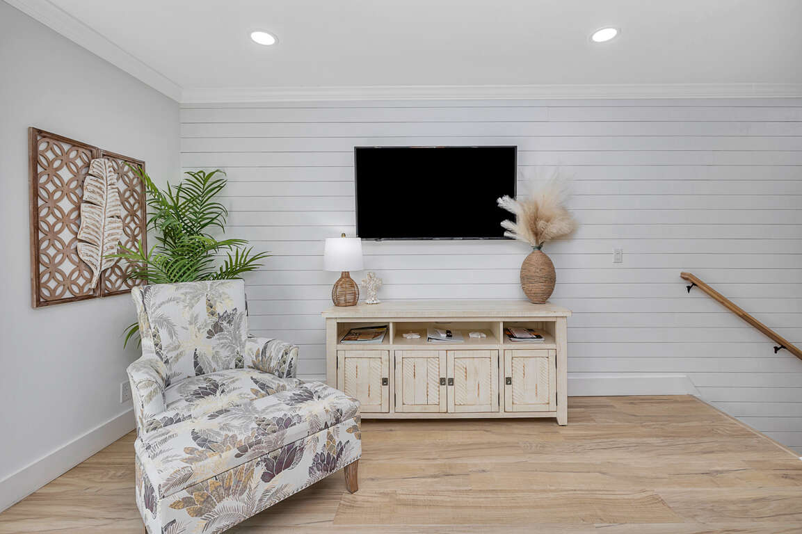 As you enter the foyer area, you will find a shiplap wall that is featured in the two downstairs bedrooms and carried through to the upstairs. The first bedroom has two twins and a smart TV. The second downstairs bedroom has a king bed, smart TV and sliding door access to the outdoor patio and the common area fire pit. The shared bathroom downstairs is brand new with a double vanity and walk-in shower.