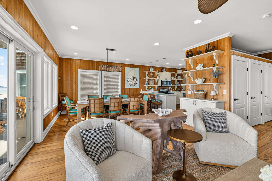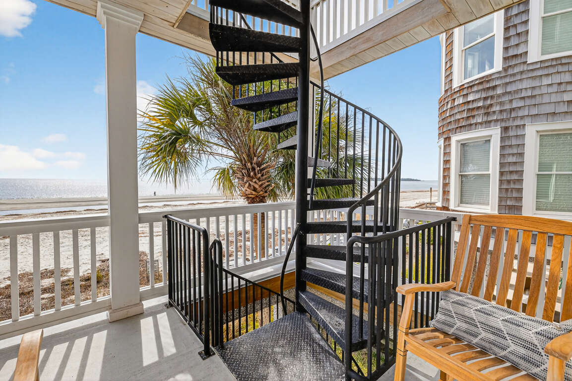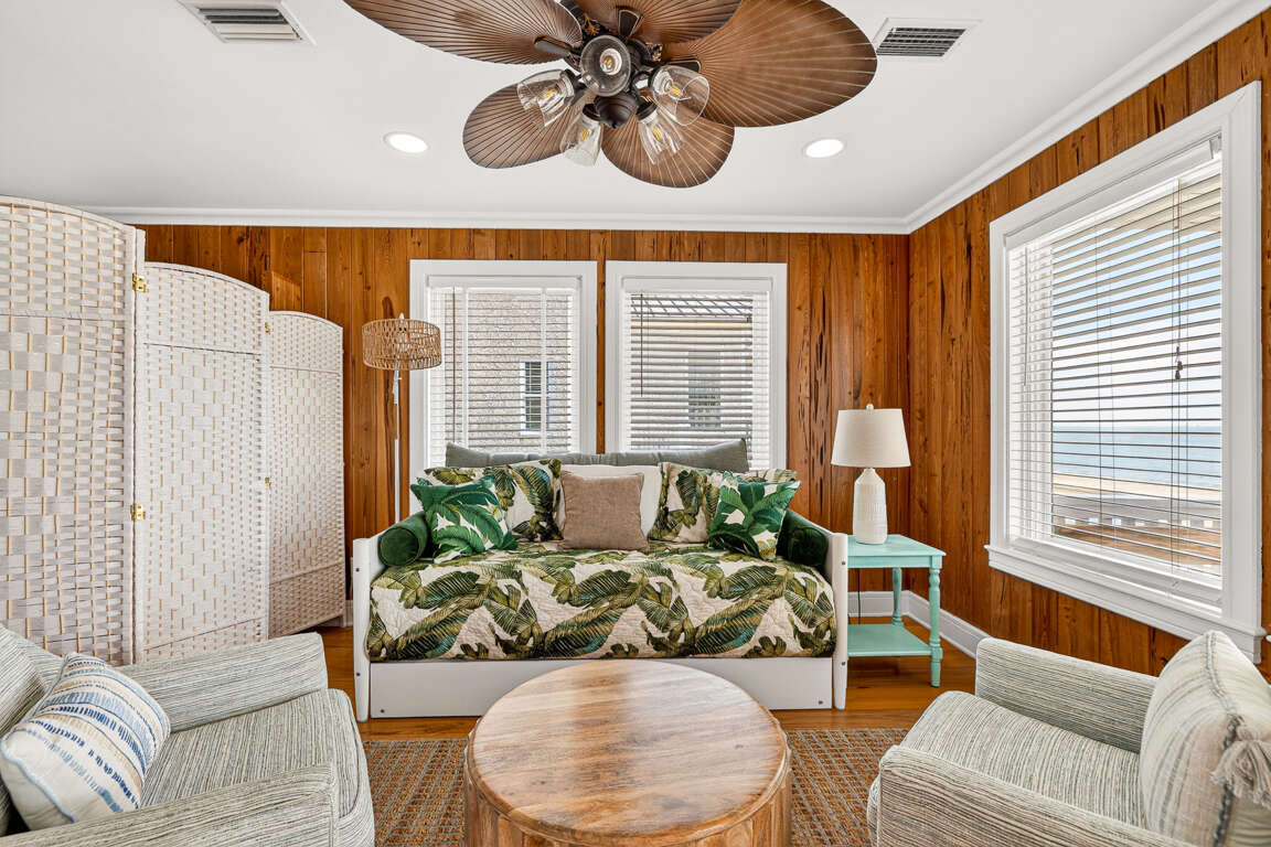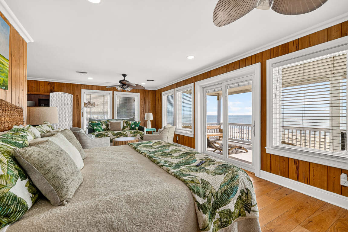 The third floor is home to a luxurious master suite, a haven of comfort and style. The king-sized bed faces the Atlantic, offering front-row seats to mesmerizing sunrises. A private kitchenette, a cozy sitting area with a Smart TV, a comfortable futon, and a day bed with a trundle make this level ideal for families or those seeking extra space. Step onto the large oceanfront deck to savor a morning coffee or evening cocktail as the ocean breeze wraps you in tranquility.
