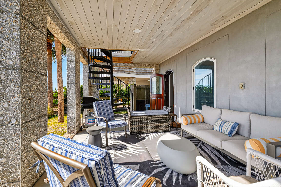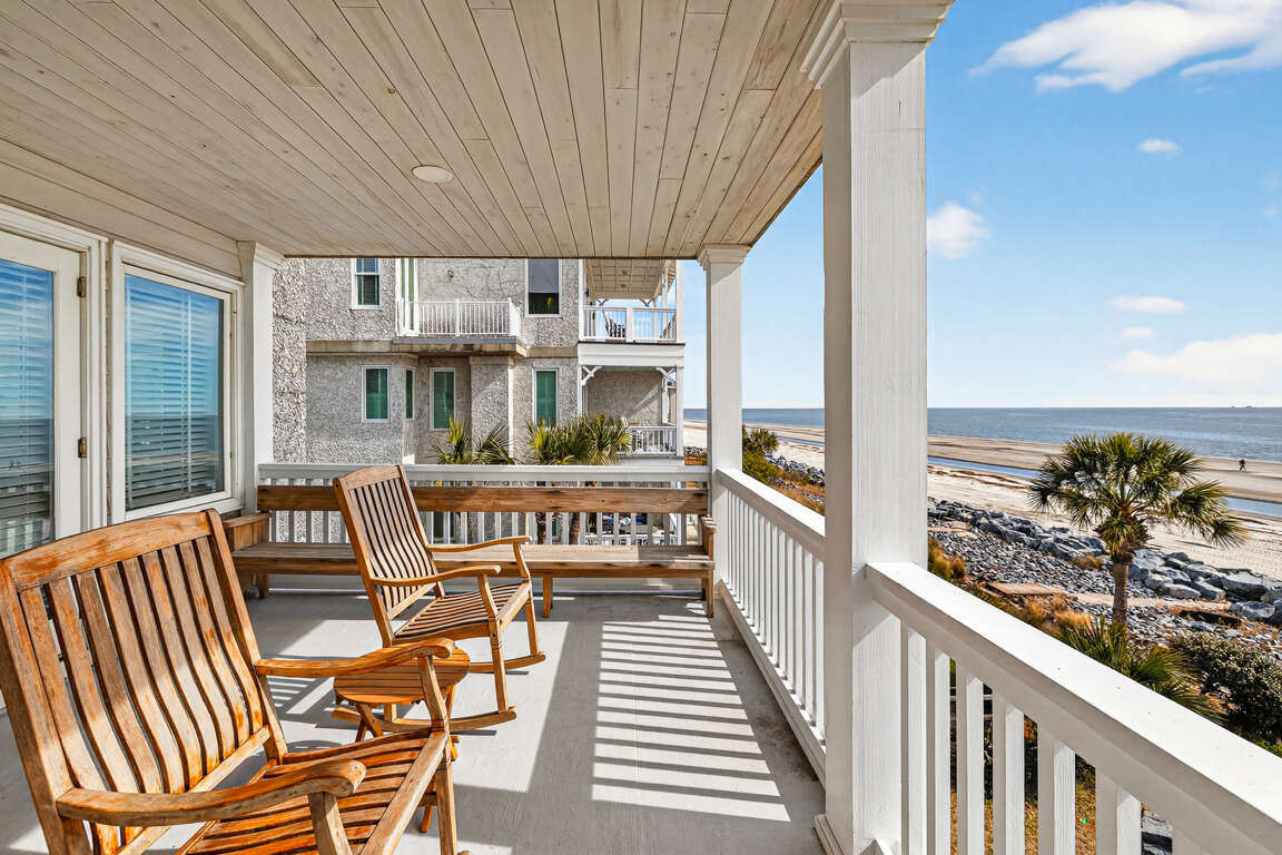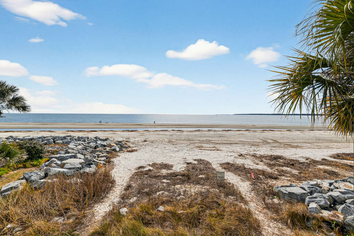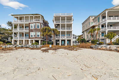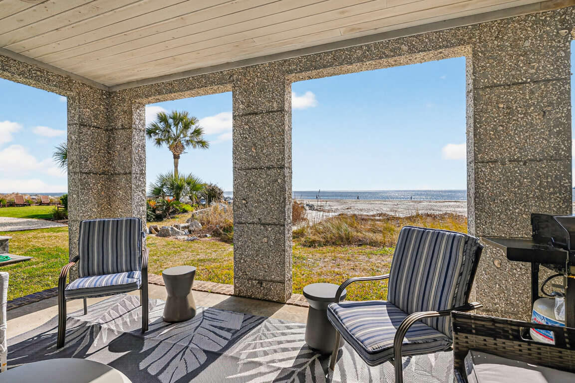 As you pull into the ground-level one-car garage, there’s ample space for your vehicle and even a golf cart for cruising the island in style. Step through the back door to a spacious oceanfront patio, where a charcoal grill awaits for sizzling beach-side barbecues as you listen to the surf. From here, a convenient elevator whisks you up to the three levels of this meticulously updated retreat, where every detail sparkles with fresh, modern elegance.