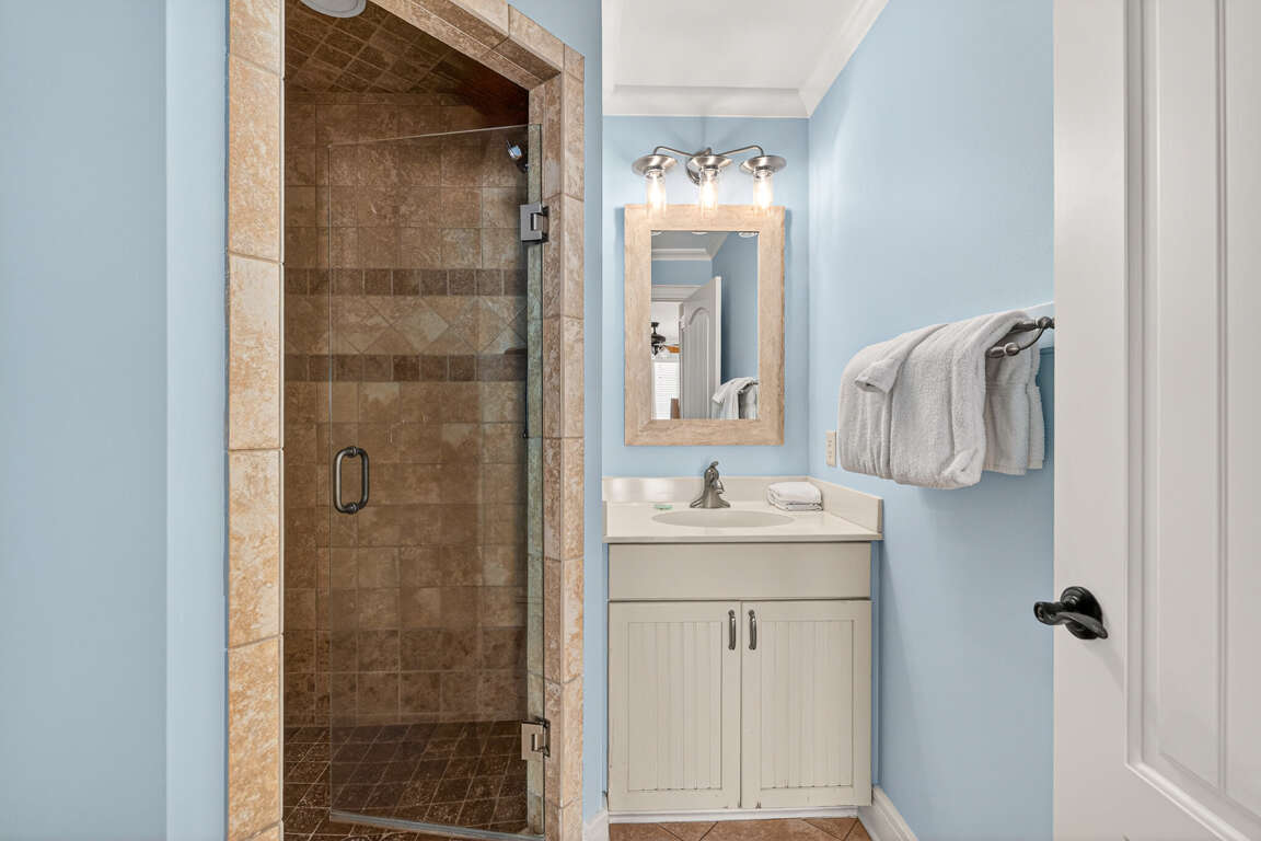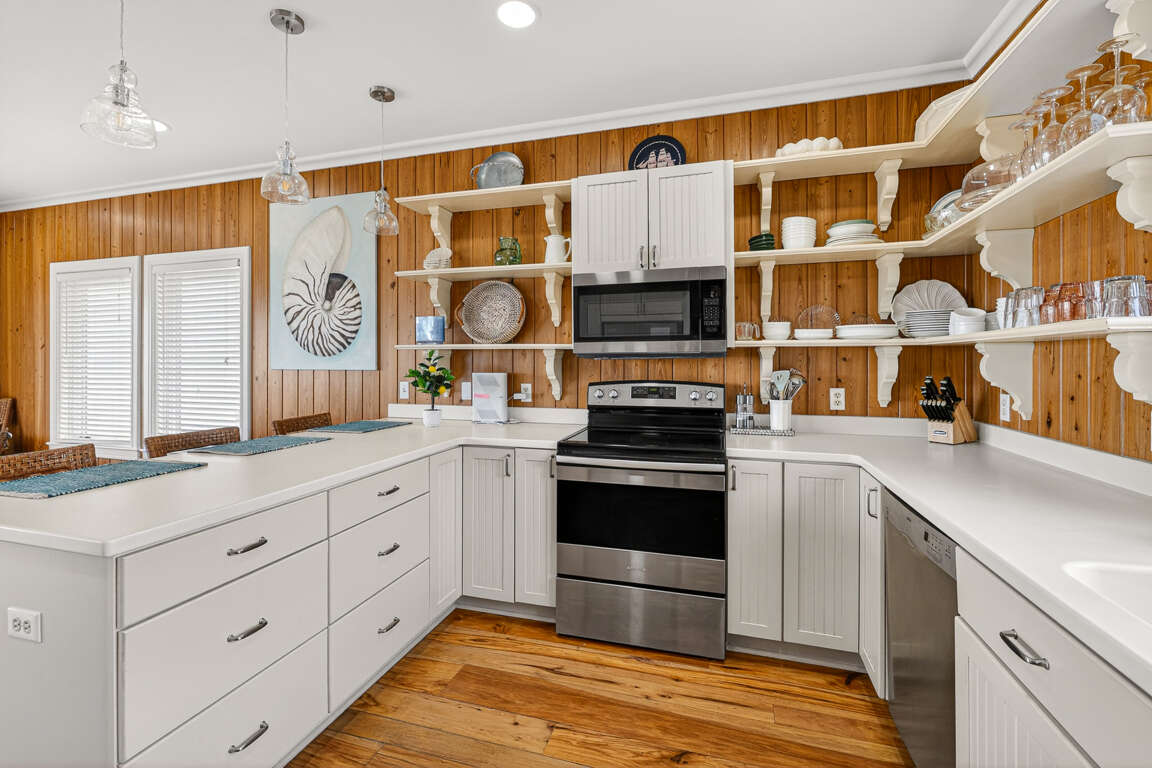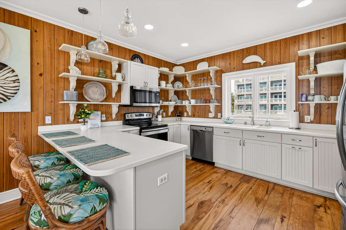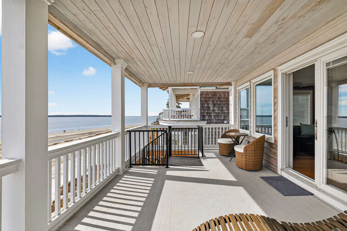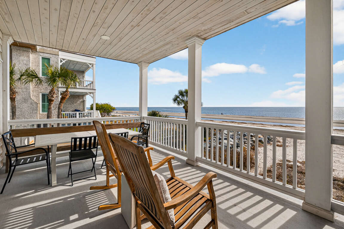 As you pull into the ground-level one-car garage, there’s ample space for your vehicle and even a golf cart for cruising the island in style. Step through the back door to a spacious oceanfront patio, where a charcoal grill awaits for sizzling beach-side barbecues as you listen to the surf. From here, a convenient elevator whisks you up to the three levels of this meticulously updated retreat, where every detail sparkles with fresh, modern elegance.
