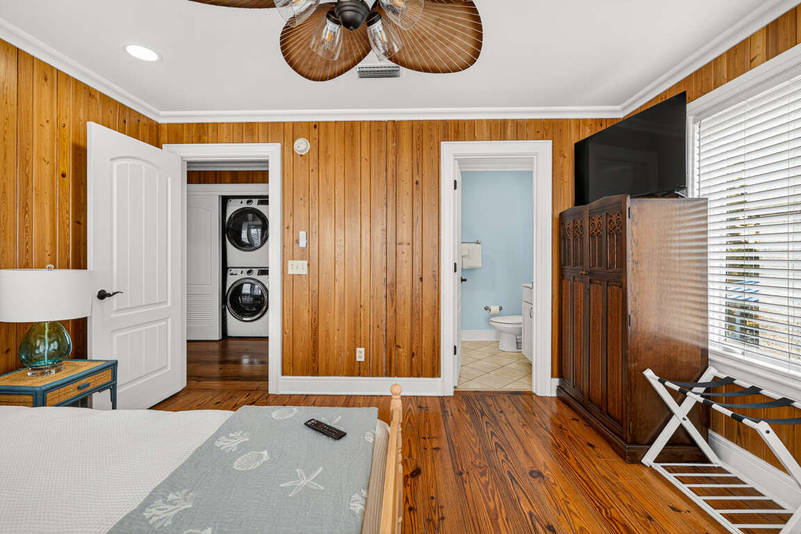 Ascend to the second level, where two serene bedrooms await, each with a cozy queen bed, a Smart TV, and direct access to another oceanfront deck that showcases the beach’s endless beauty. Wake up to the sight of waves crashing and seabirds soaring, then head to the conveniently located laundry room to keep things fresh during your stay.