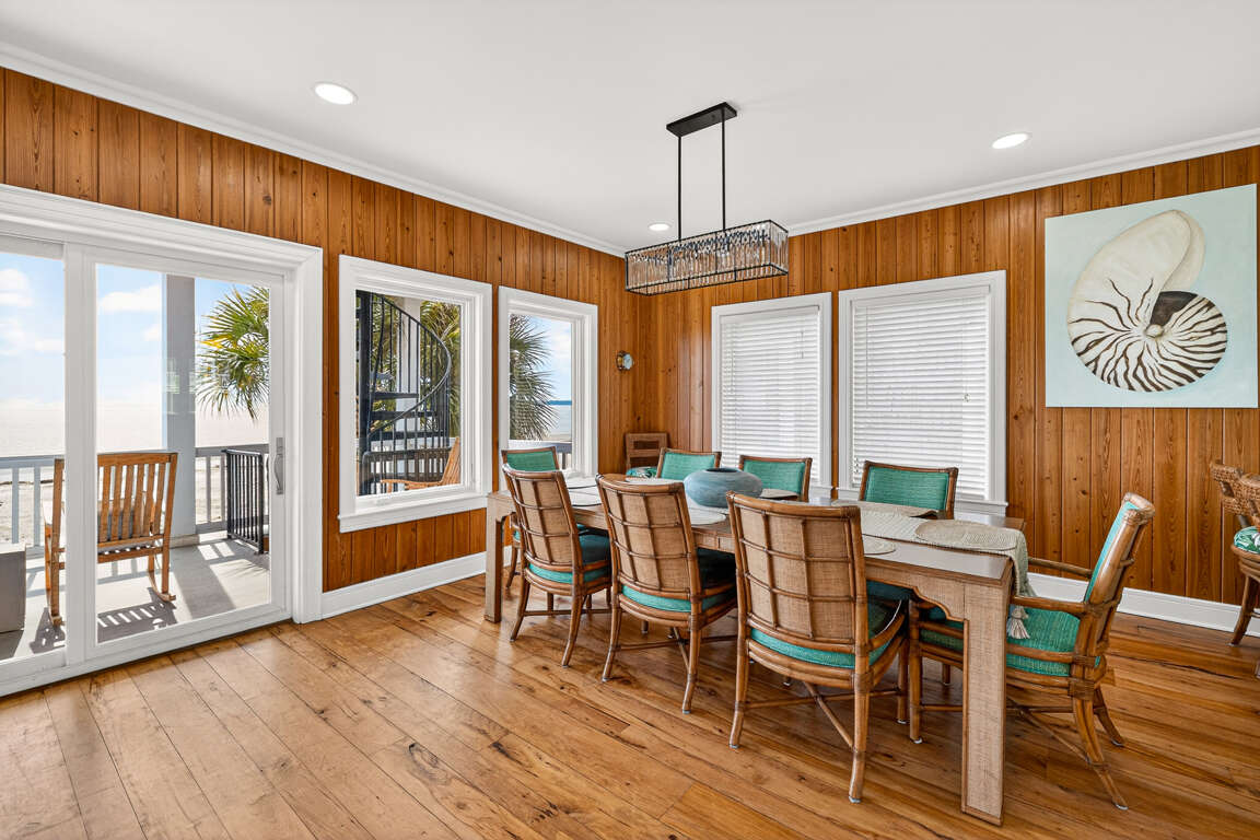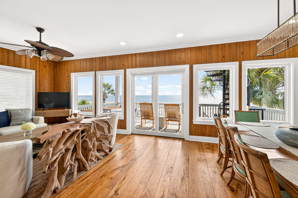 On the first living level, an open-concept design welcomes you with a fully stocked kitchen that’s a chef’s dream, complete with gleaming appliances and everything you need to whip up a feast. The dining area seats eight at a grand table, with three additional spots at the kitchen bar, perfect for lively group meals or casual snacks. The adjacent living room invites relaxation with a Smart TV and plush seating, while the expansive oceanfront deck beckons you to step outside and soak in panoramic views of the Atlantic, with Jekyll and Cumberland Islands shimmering in the distance.