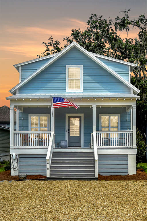 Enjoy evening breezes and spectacular sunsets from the large front porch overlooking the western marsh—the perfect spot to unwind after a day at the beach or exploring the island.