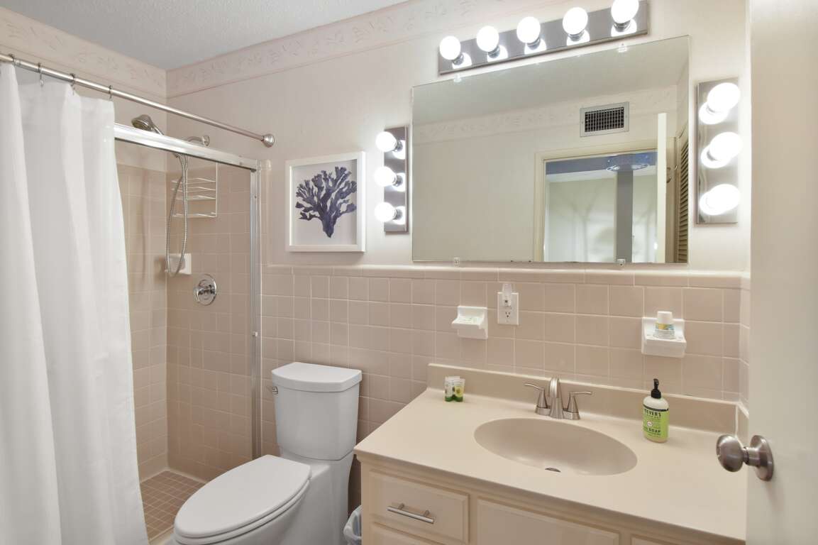 Full bathroom with a modern tiled shower conveniently located between the bedrooms