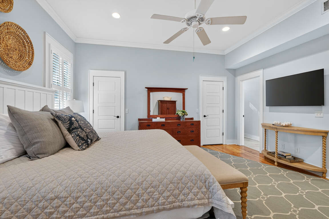 Master suite on the main floor: King bed, 50-inch smart TV, and a convenient sitting area right between the bedroom and kitchen β perfect for quiet morning coffee or a peaceful retreat.