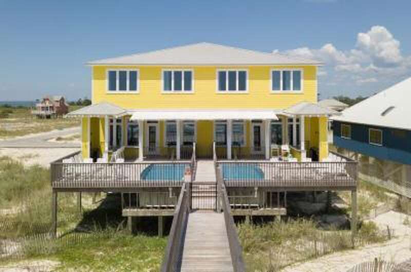 Banana Split is the luxury vacation rental in the Banana Cabana family of homes in Fort Morgan. Like Banana Cabana 2.0, Banana Split is raising the bar in the Gulf front duplex category. Banana Split is the only duplex in the Gulf that offers a private pool and outdoor Cabana Bar for EACH SIDE. Each of Banana Split's pools are raised 15 ft. above the dunes thus giving you stunning views while offering each side privacy. Sit around your private pool or in your private Cabana Bar enjoying the sunset. Each side of Banana Split sleeps 19 people in BEDS. In these professionally decorated duplexes, you have 7 bedrooms, and 7.5 baths. Each side of Banana Split has 4 master bedrooms each with its own private bath. The other 3 bedrooms are all bunk rooms with private baths that sleep at least 3 guests per room. Right across the hall from the bunk rooms is a kid's living room so the kids have a place to hang out! Every bed features a luxury pillow top mattress for the best sleep of your life! Every room in the house has a brand new flat screen TV with the highlight being a 60' flat screen TV located in the living room. Hi Speed WI-FI is also available for your convenience. The kitchen is designed to feed an army with 2 full size refrigerators, 2 ovens, 2 dishwashers, microwave, ice machine, 2 sinks, 2 disposals, and more!. A unique feature in Banana Split is we have installed a washer/dryer on the first AND second floor for your convenience. And finally, if this wasn't enough Banana Split is the ONLY duplex on the Gulf that can be rented and used as one massive house! We have designed Banana Split in a way that each side and each floor of the duplex can be opened up into one big house. If you have a big family reunion, anniversary, sports group, etc. we have the ability to host the whole group. ABSOLUTELY NO SMOKING AND NO PETS!!!! This unit rents on a Saturday to Saturday basis during the summer. There is a 3 night minimum during the "off-season". Weddings and Birthday parties are permitted. Contact us directly for more information as rates will vary for events. This property is equipped with surveillance cameras in the pool area. **The pool can be heated. Please note that during December, January and February we can not and will not guarantee the water will get warm enough due to cold temperatures and the fact that the pools are raised and are not insulated by the surrounding ground. In general, the pool temp can not and will not be guaranteed above 80 degrees.** FOR ALL GUESTS INCLUDING AIRBNB AND VRBO: The cancellation policy is 145 days PRIOR to date of arrival for a refund. WE RENT A YEAR TO THE DATE. IF YOU MAKE A RESERVATION BEFORE THE CURRENT GUEST REFUSES RENTAL FOR THE FOLLOWING YEAR, WE RESERVE THE RIGHT TO CANCEL YOUR RESERVATION AND REFUND YOUR MONEY.