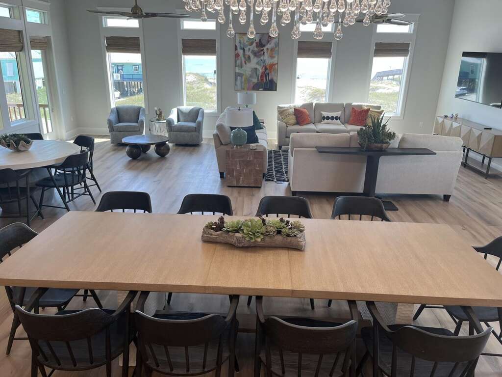 Banana Bungalow – Sleeps 22 | Covered Pool | Gulf & Bay Views | Elevator | Gourmet Kitchen Banana Bungalow is your dream beach retreat in Fort Morgan—a thoughtfully designed, luxury home that brings together style, comfort, and coastal charm. This spacious six-bedroom, six-and-a-half-bath home comfortably sleeps up to 22 guests and offers stunning views of both the Gulf of Mexico and Mobile Bay. Every bedroom features a private en-suite bathroom, providing comfort and privacy for all guests. There are four king suites, one bunk room with six twin beds, and a unique, adult-friendly bunk room featuring two king beds on the bottom and queen beds above—ideal for families or groups of friends. On the first floor, you’ll find a chef’s kitchen with three ovens, a six-burner gas range, two full-size refrigerators, and a commercial-sized ice maker. The adjoining wet bar is perfect for serving drinks or setting up a coffee station. An oversized dining area offers plenty of space to gather, while the expansive main living area—with a 72-inch TV and panoramic Gulf views—serves as the heart of the home. This level also includes a Gulf-view king master suite, a powder bath, a laundry room, and elevator access to the upper floor. The second floor includes three more king master suites—two with Gulf views (one with a private balcony) and one with a Bay view. There are also two bunk rooms: one with two sets of queen-over-KING bunks and another with three sets of twin bunks, ideal for kids or additional guests. A second living area with another 72-inch TV, a 3rd living area perfect for TV gaming, another laundry room, and continued elevator access make this floor just as accommodating as the first. Outside, a custom covered pool offers a shaded retreat with direct Gulf views, while the IPE Brazilian hardwood deck adds a touch of luxury to your lounging space. A second-floor balcony provides elevated views of the water. Under the house you’ll find a large propane grill is ready for family cookouts. Covered parking for up to six vehicles, plus additional driveway space, ensures plenty of room for everyone. With a whole-home generator and corporate-level wireless network, Banana Bungalow ensures seamless comfort, no matter what. Whether you’re planning a family reunion, a group getaway, or simply want to unwind in style by the sea, Banana Bungalow is ready to welcome you with luxury, space, and unforgettable views.