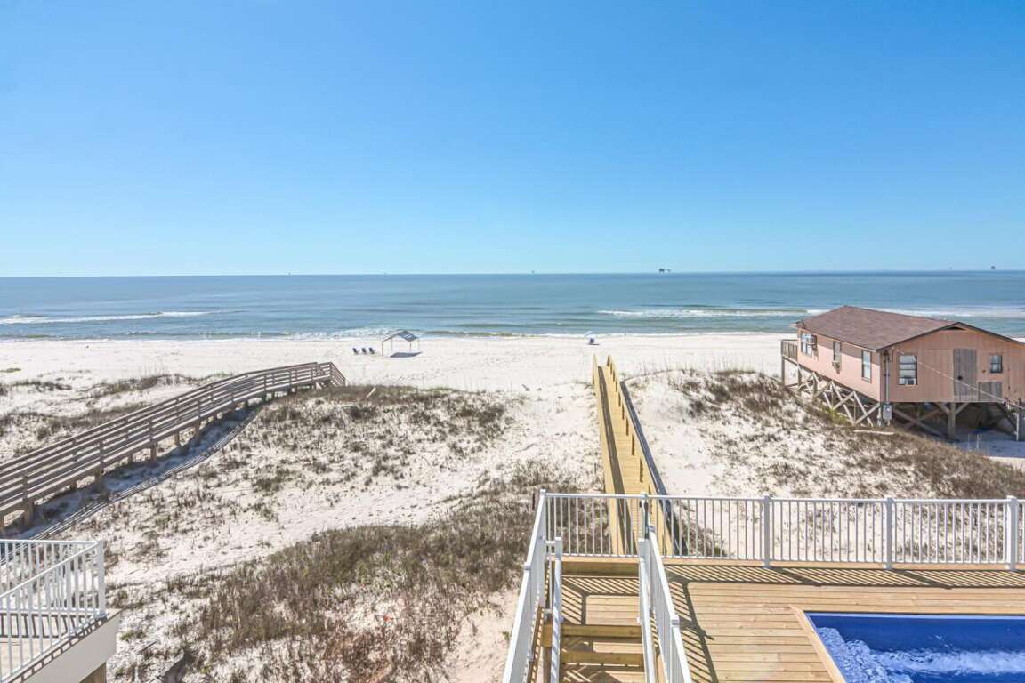 This property is not pet-friendly. Minimum Age Requirement of 25. Welcome to After Dune Delight, a stunning 6-bedroom, 6-bath Gulf-front beach house in Fort Morgan. Perfect for large families, reunions, or group vacations, this spacious retreat sleeps up to 16 guests and offers direct beach access, private balconies, and endless Gulf views. Bedroom Details: Master Bedroom 1: King bed, private bath, balcony access, flat-screen TV Master Bedroom 2: King bed, private bath, balcony access, flat-screen TV Bedroom 3: King bed, private bath, TV Bedroom 4: King bed, private bath, TV Bedroom 5: Queen bed, shared bath, TV Bedroom 6: Two twin beds, shared bath, TV Bunk Room: Two twin beds + flat-screen TV, shared bath Home Highlights: Direct Gulf-front location with private beach access Expansive deck with outdoor seating and panoramic ocean views Large open living and dining areas filled with natural light Fully equipped kitchen with modern appliances and cookware Flat-screen TVs throughout, plus washer & dryer for convenience Covered parking and driveway space Why You’ll Love It: Spend your days swimming in the Gulf, sunbathing on the sand, or relaxing on the deck as the waves roll in. In the evenings, enjoy BBQ dinners, family gatherings, and breathtaking sunsets over the water. With its unbeatable size and location, After Dune Delight is built for unforgettable coastal memories.