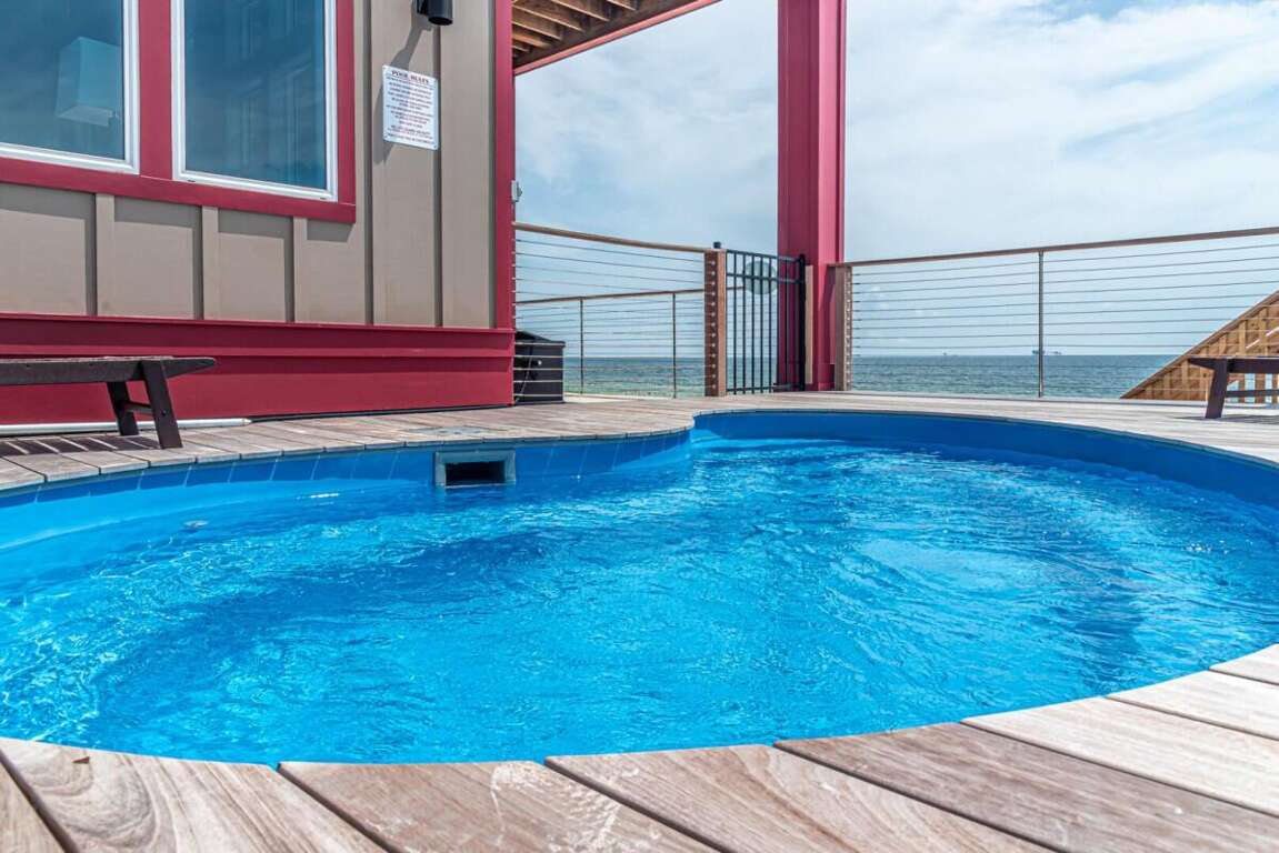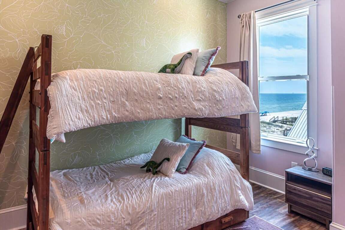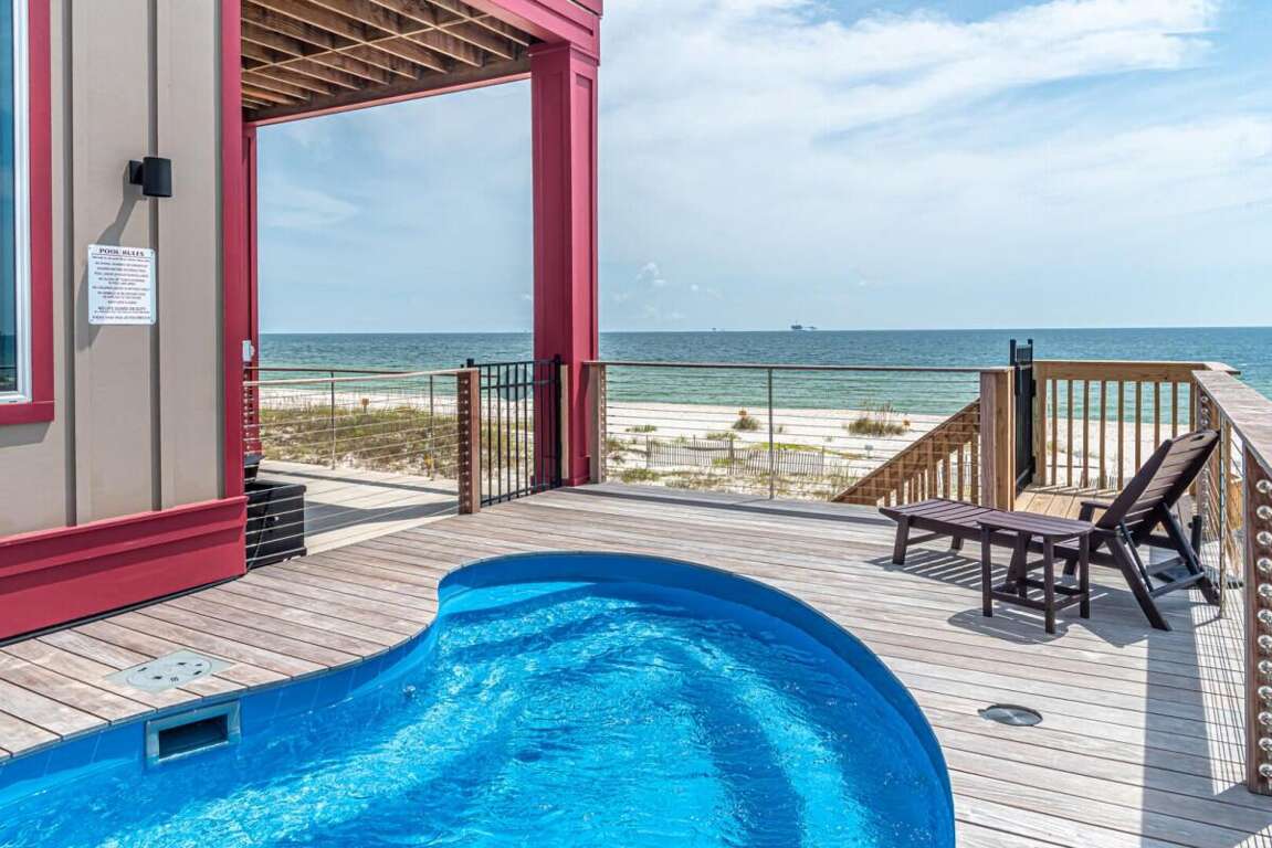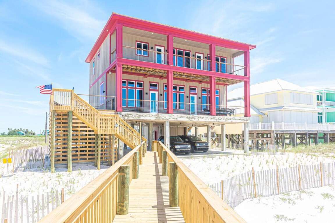 This property is not pet friendly. Minimum Age Requirement of 25. Home rents Saturday to Saturday only during peak season unless approved by the homeowner or calendar is already broken up. Welcome to Coco Bella, a beautifully designed 4-bedroom, 3.5-bath Gulf-front retreat that perfectly blends modern luxury with beachside comfort. With 3,976 sq. ft. of living space, private pool, elevator, and room to sleep up to 8 guests, this home is the ideal choice for families or groups seeking an upscale coastal getaway. Bedroom Details: Master Suite: King bed, private en-suite bath, TV Bedroom 2: Queen bed, private en-suite bath, TV Bedroom 3: Queen bed, private en-suite bath, TV Bedroom 4: Bunk bed (2 twins), TV Home Highlights: Private Gulf-front pool Spacious open-concept living area with vaulted ceilings and coastal décor Fully equipped gourmet kitchen with premium appliances, double refrigerators, and large island with bar seating Expansive dining table perfect for large family meals Multiple en-suite bedrooms for added privacy Elevator for convenience Large decks and outdoor seating areas with panoramic beach views Washer/dryer included Why You’ll Love It: Coco Bella offers the ultimate Gulf Coast experience—whether you’re relaxing by your private pool, dining on the expansive deck with sweeping ocean views, or enjoying the easy beach access just steps away. Designed with both luxury and comfort in mind, this property ensures that every moment of your stay feels special. Spacious interiors, a chef’s dream kitchen, and breathtaking sunsets over the Gulf make Coco Bella the perfect setting for your next Fort Morgan vacation.