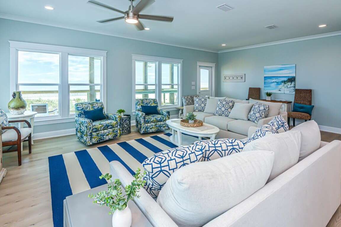 This property is not pet friendly. Must be 25+ to book. Welcome to Sand Haven East, a spacious Gulf-front duplex that’s perfect for large families and groups looking for a comfortable beach retreat. With 6 bedrooms, 5 bathrooms, and space to accommodate up to 18 guests, this home offers plenty of room for everyone to spread out while enjoying breathtaking Gulf views right from your doorstep. Bedrooms by Level: Bedroom 1 (Master): King bed, private bath, located on level 1 Bedroom 2: Queen bed, located on level 1 Bedroom 3: Queen bed, private bath, located on level 2 Bedroom 4: Queen bed, located on level 2 Bedroom 5: Queen bed, located on level 2 Bedroom 6: Twin-over-Twin Bunk beds, located on level 2 Home Highlights: Gulf-front duplex with direct beach access Open-concept living and dining areas with Gulf views Fully equipped kitchen with large island and ample counter space Multiple bedrooms with flexible bedding for groups of all sizes 5 full bathrooms to accommodate large groups with ease Washer and dryer included for guest convenience Spacious layout perfect for family gatherings Why You’ll Love It: Sand Haven East is designed with group comfort in mind. Step out to the sand just beyond your door, gather for meals in the open kitchen and dining area, or relax in the spacious living room while enjoying Gulf views. With 6 bedrooms and thoughtful amenities, this duplex is ideal for family reunions, multi-family vacations, or group getaways. Enjoy the beauty of Fort Morgan while having all the space you need for a memorable beach retreat.
