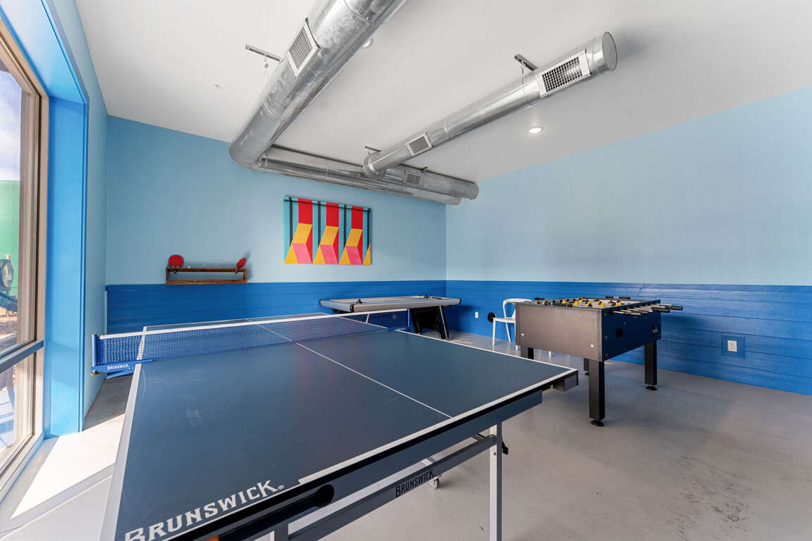 At Laketopia Lodge, a wealth of resort amenities and activities awaits guests, enhancing the overall experience of relaxation and recreation. Families can immerse themselves in outdoor adventures, exploring the two inviting outdoor pools, lazy river, and an indoor pool perfect for year-round enjoyment. The treehouse playground delights younger guests, while older ones can engage in friendly competition on the half basketball court or pickleball courts. Evenings bring opportunities for family bonding around the communal firepit, ideal for storytelling and roasting marshmallows under the stars. Inside, the lower-level living area offers ping pong and various games to enjoy together. Additionally, a private hot tub provides a serene retreat, ensuring a memorable stay for all who visit Laketopia Lodge.