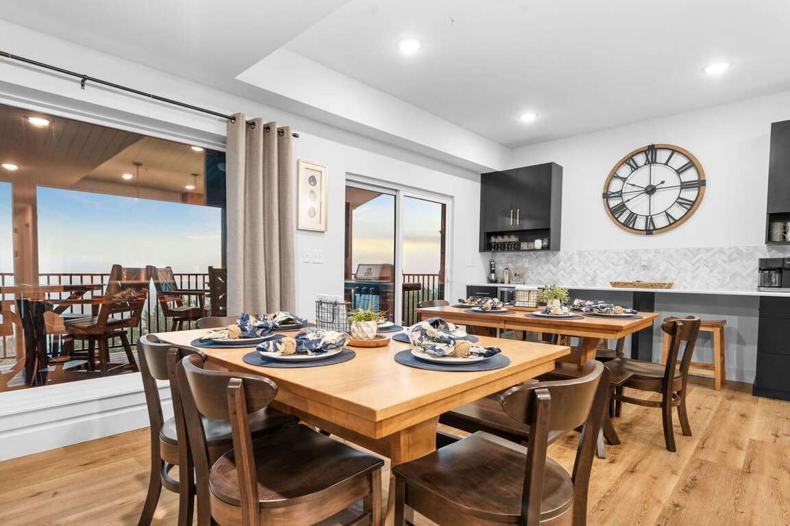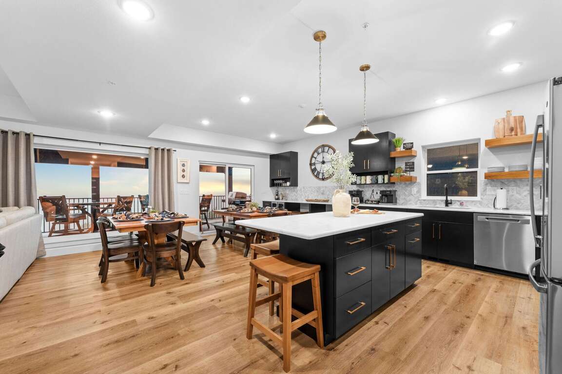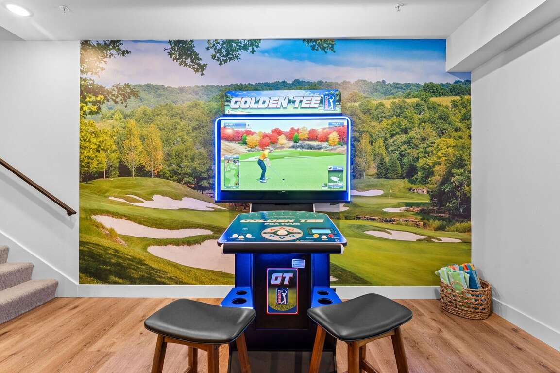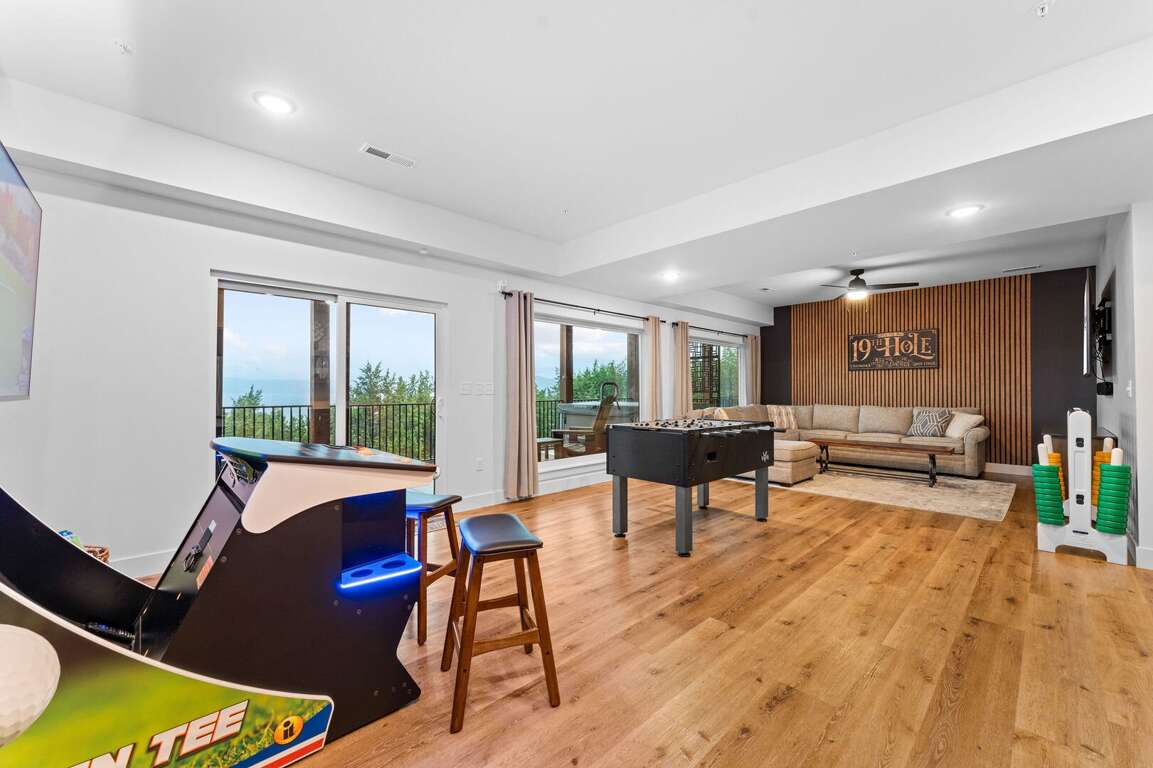 Inside Over The Top, guests will find a thoughtfully designed space that seamlessly blends comfort and entertainment. The spacious kitchen design features ample seating, making it perfect for family meals and gatherings. Equipped with modern appliances and a generous layout, it invites culinary creativity while fostering togetherness. Adjacent to the kitchen, the lively game room offers hours of fun with classic Golden Tee and foosball tables, ensuring that guests of all ages can unwind and enjoy themselves. A large sectional couch in the entertainment area is ideal for movie nights, complemented by a 75" TV that enhances the viewing experience. For ultimate relaxation, a hot tub outside the game room overlooks the stunning lake, providing a perfect retreat after a day of excitement.