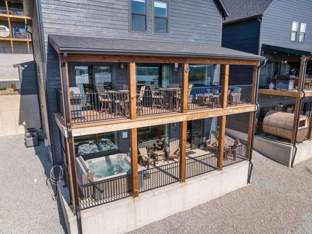 Situated along the serene shores of Table Rock Lake, Over The Top is a premier lakefront home located at 181 Shoreline Ln, Hollister, Missouri. This expansive property boasts nine bedrooms and nine full bathrooms, accommodating up to 22 guests, making it an ideal setting for memorable family gatherings. The home's design encourages bonding over lakefront activities, whether it's fishing, boating, or simply enjoying the picturesque views from the outdoor decks. With spacious common areas and a well-equipped kitchen, families can create lasting memories over shared meals and laughter. The property's unique features and strategic layout provide ample opportunities for relaxation and recreation, ensuring that every guest experiences the charm and beauty of this remarkable lakefront retreat.
