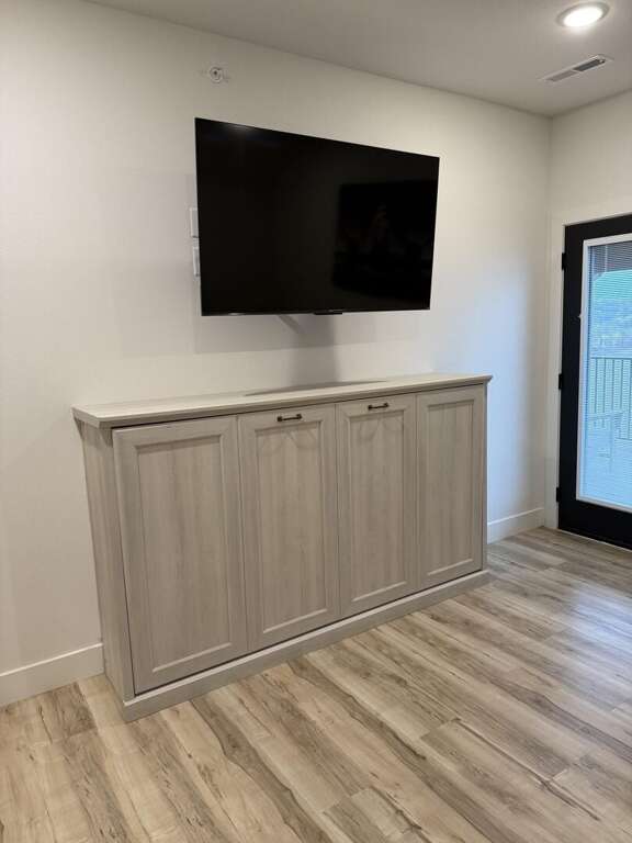 Situated within the inviting layout of this lakeside retreat, the interior of Hanger 151 seamlessly blends comfort and modern design, creating an atmosphere ideal for both relaxation and entertainment. The open concept design connects the kitchen, dining, and living areas, allowing for effortless flow and interaction among guests. The living room features a cozy fireplace, perfect for unwinding after a day of exploration. The fully-equipped kitchen caters to both casual and formal dining experiences, while the dedicated entertainment space boasts a wet bar, refrigerator, and theatre seating, ensuring memorable gatherings. Step outside to find a private hot tub and patio furniture, inviting guests to embrace the serene surroundings, making every moment spent here truly special.