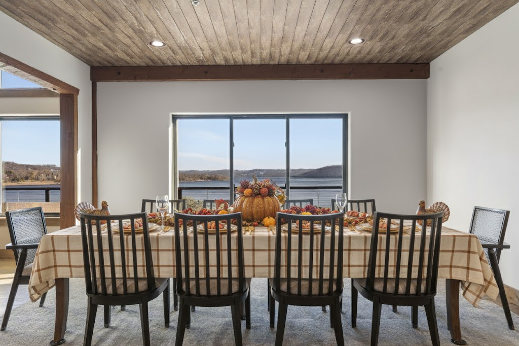 Inside, you'll be in awe at the open-concept living area with 26-foot vaulted ceilings, a floor-to-ceiling stone gas fireplace, and a wall of windows that flood the space with natural light while framing breathtaking lake views. The fully-equipped kitchen is a chef's dream with a 48" gas range with griddle, double ovens, a 10-foot island, and a Smart TV. Gather around the dining table where meals become cherished moments, while the sun glistens on the lake just beyond. Step out onto the main level deck to discover your private oasis. Jump into the seasonal outdoor pool, soak in the private hot tub, or relax with the game on the 75" Smart TV all with Table Rock Lake as the back drop.<br />
